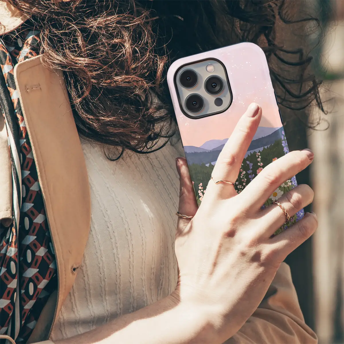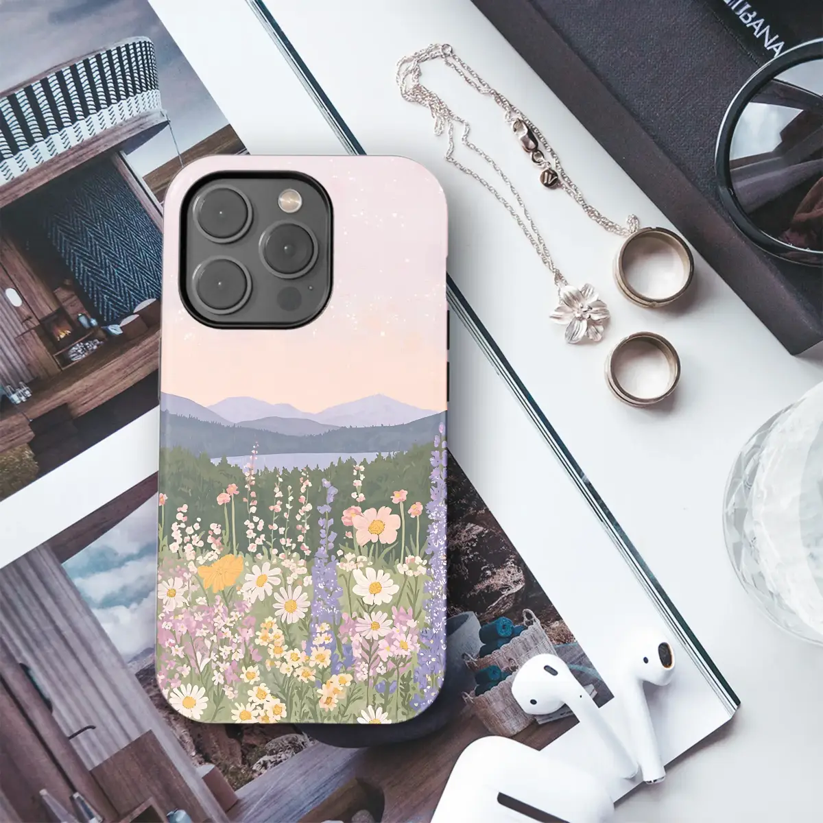 Wander into a world of serene beauty and gentle daydreams with this breathtaking artistic design, a perfect escape from the everyday hustle. Imagine yourself standing at the edge of a vibrant meadow, where a rich tapestry of wildflowers in soft pastel shades of pink, lavender, yellow, and cream dance in a soft, imaginary breeze. Delicate daisies turn their faces to the sun, while tall spires of larkspur and cheerful cosmos reach towards a dreamy, blush-pink sky, which is artfully speckled with ethereal bokeh light effects that suggest a magical atmosphere. Beyond this floral paradise, a tranquil blue lake mirrors the sky, nestled amongst deep layers of lush green pine forests and misty, distant mountains that fade into a soft lavender haze. This enchanting landscape captures the quiet magic of a perfect pastoral moment, blending a whimsical cottagecore aesthetic with the timeless beauty of a mountain vista. It’s an ideal gift for the nature lover or dreamer in your life. Let this miniature masterpiece adorn your most-used essential, transforming it into a daily portal to a hand-painted sanctuary of peace and a constant reminder of nature's gentle embrace.