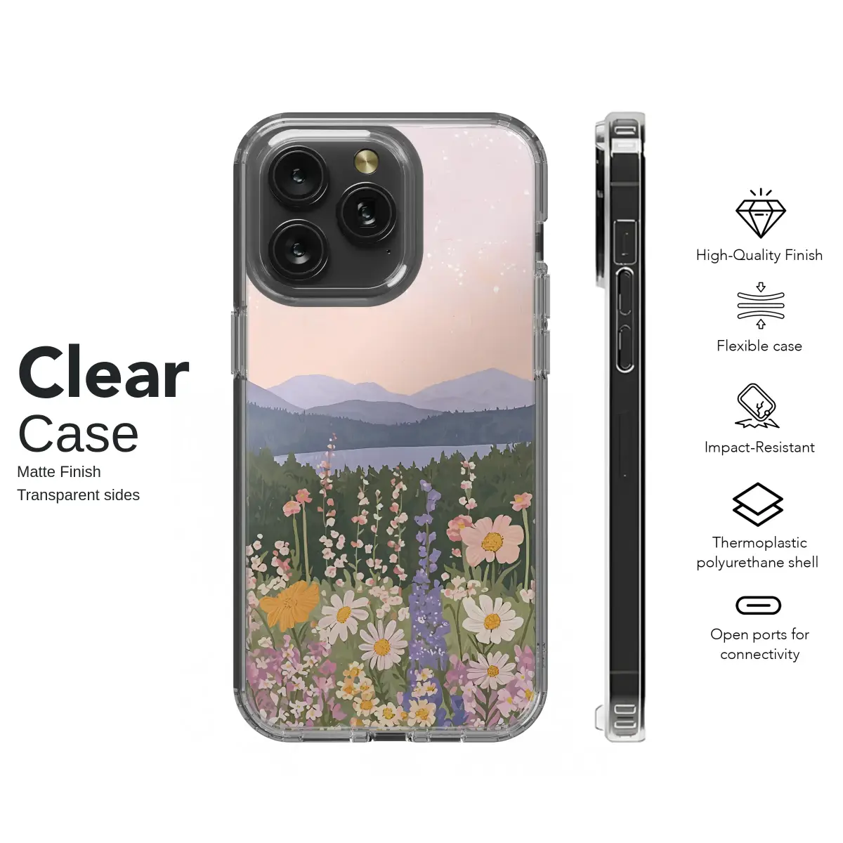 Wander into a world of serene beauty and gentle daydreams with this breathtaking artistic design, a perfect escape from the everyday hustle. Imagine yourself standing at the edge of a vibrant meadow, where a rich tapestry of wildflowers in soft pastel shades of pink, lavender, yellow, and cream dance in a soft, imaginary breeze. Delicate daisies turn their faces to the sun, while tall spires of larkspur and cheerful cosmos reach towards a dreamy, blush-pink sky, which is artfully speckled with ethereal bokeh light effects that suggest a magical atmosphere. Beyond this floral paradise, a tranquil blue lake mirrors the sky, nestled amongst deep layers of lush green pine forests and misty, distant mountains that fade into a soft lavender haze. This enchanting landscape captures the quiet magic of a perfect pastoral moment, blending a whimsical cottagecore aesthetic with the timeless beauty of a mountain vista. It’s an ideal gift for the nature lover or dreamer in your life. Let this miniature masterpiece adorn your most-used essential, transforming it into a daily portal to a hand-painted sanctuary of peace and a constant reminder of nature's gentle embrace.