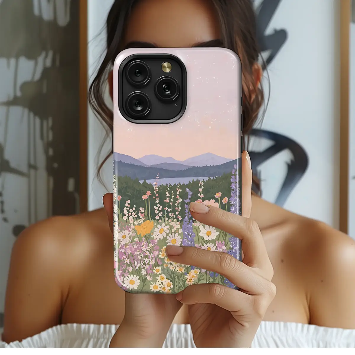 Wander into a world of serene beauty and gentle daydreams with this breathtaking artistic design, a perfect escape from the everyday hustle. Imagine yourself standing at the edge of a vibrant meadow, where a rich tapestry of wildflowers in soft pastel shades of pink, lavender, yellow, and cream dance in a soft, imaginary breeze. Delicate daisies turn their faces to the sun, while tall spires of larkspur and cheerful cosmos reach towards a dreamy, blush-pink sky, which is artfully speckled with ethereal bokeh light effects that suggest a magical atmosphere. Beyond this floral paradise, a tranquil blue lake mirrors the sky, nestled amongst deep layers of lush green pine forests and misty, distant mountains that fade into a soft lavender haze. This enchanting landscape captures the quiet magic of a perfect pastoral moment, blending a whimsical cottagecore aesthetic with the timeless beauty of a mountain vista. It’s an ideal gift for the nature lover or dreamer in your life. Let this miniature masterpiece adorn your most-used essential, transforming it into a daily portal to a hand-painted sanctuary of peace and a constant reminder of nature's gentle embrace.