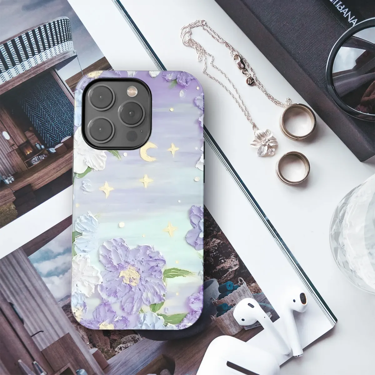 Adorn your device with this dreamy floral design, featuring a palette of soft purples, lavenders, and hints of mint. The richly textured, impasto style creates a captivating three-dimensional effect, bringing the whimsical blooms to life. Delicate crescent moons and twinkling stars add a touch of celestial magic to this enchanting scene, perfect for adding a touch of whimsical elegance to your everyday. This high-resolution artwork is printed with vibrant, fade-resistant inks ensuring your design stays beautiful for years to come. Elevate your style with this unique and artistic accessory, guaranteed to turn heads and spark conversations. The perfect blend of romantic and ethereal, this design is ideal for those who appreciate artistry and unique, eye-catching aesthetics. Express your individuality and add a personalized touch to your belongings. It's a delightful gift for yourself or a loved one, bringing joy and a touch of dreamy enchantment wherever you go. Search terms: floral, purple, lavender, flowers, pastel, moon, stars, celestial, impasto, textured, art, dreamy, romantic, whimsical, unique, elegant.