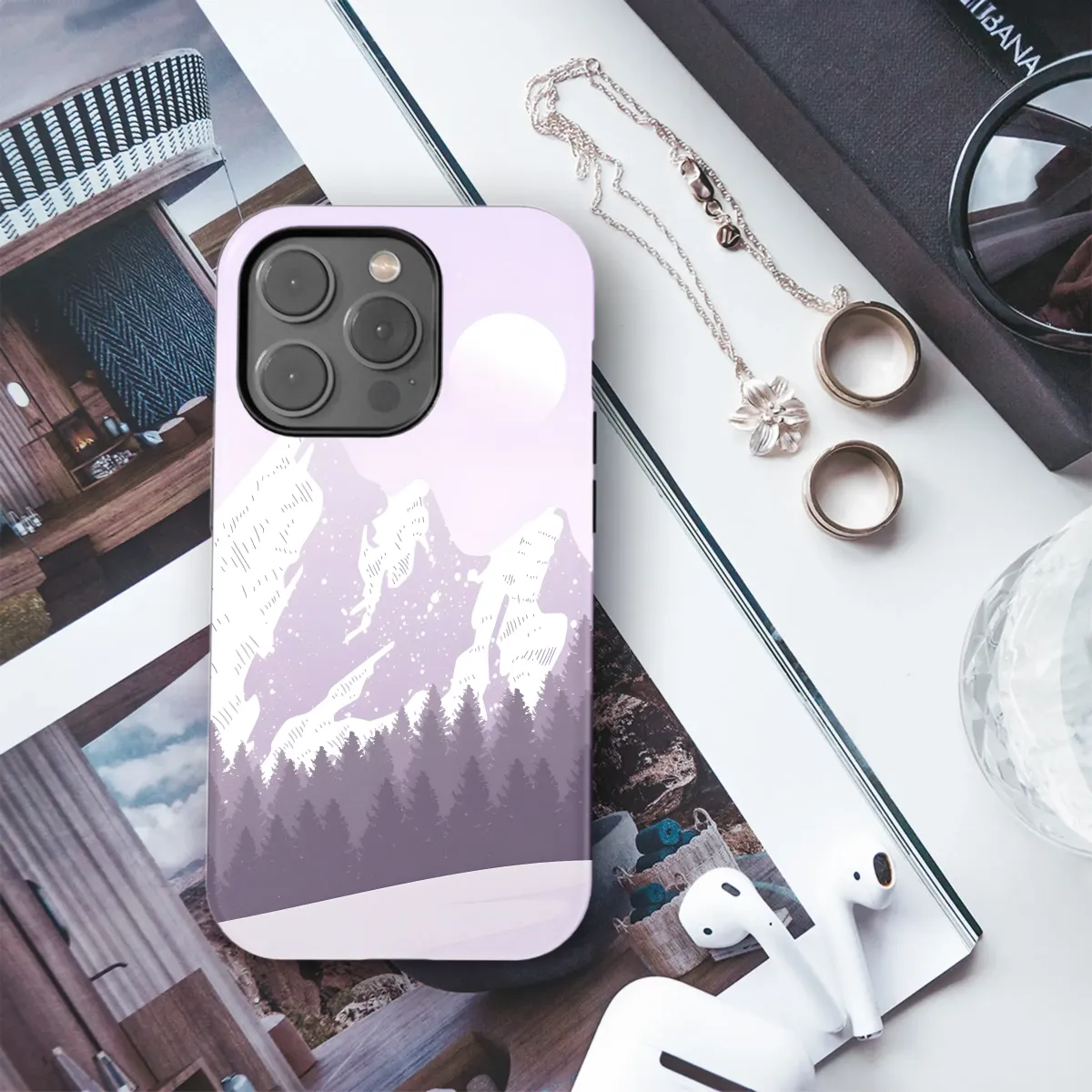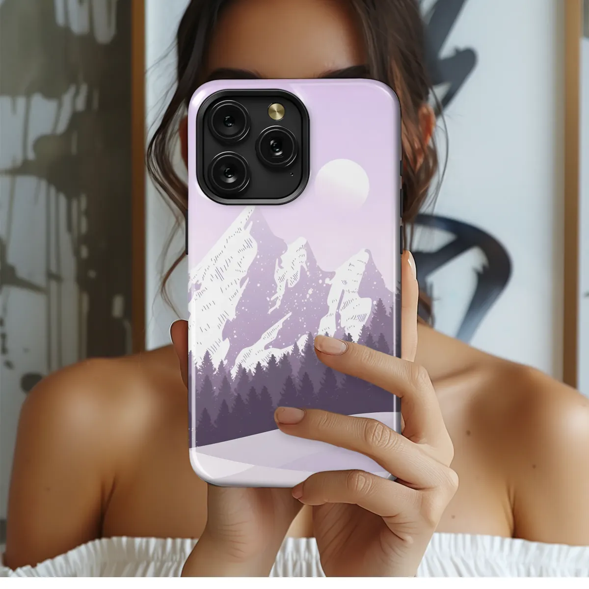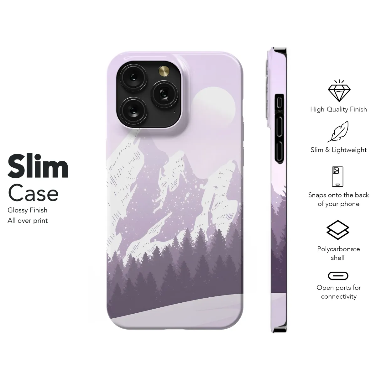 Embrace the serene beauty of a winter wonderland with this captivating design. Silhouetted evergreens stand guard before majestic snow-capped mountains under a luminous moonlit sky. Delicate snowflakes dance amidst a soft lavender and purple palette, creating a dreamy, peaceful atmosphere. This artistic print adds a touch of sophisticated elegance to your personal style, transforming your everyday accessory into a statement piece. The design is printed with high-quality inks on durable materials, ensuring vibrant colors and lasting protection. Perfect for the nature lover, the art enthusiast, or anyone seeking a tranquil escape, this design will bring a sense of calm and wonder wherever you go. It’s a unique gift for friends, family, or yourself, offering a subtle yet striking visual that's both stylish and memorable. Add a touch of magic to your life with this enchanting winter scene. Search terms: winter, mountains, moon, snow, forest, purple, lavender, nature, art, elegant, serene, peaceful, dreamy, sophisticated, gift.