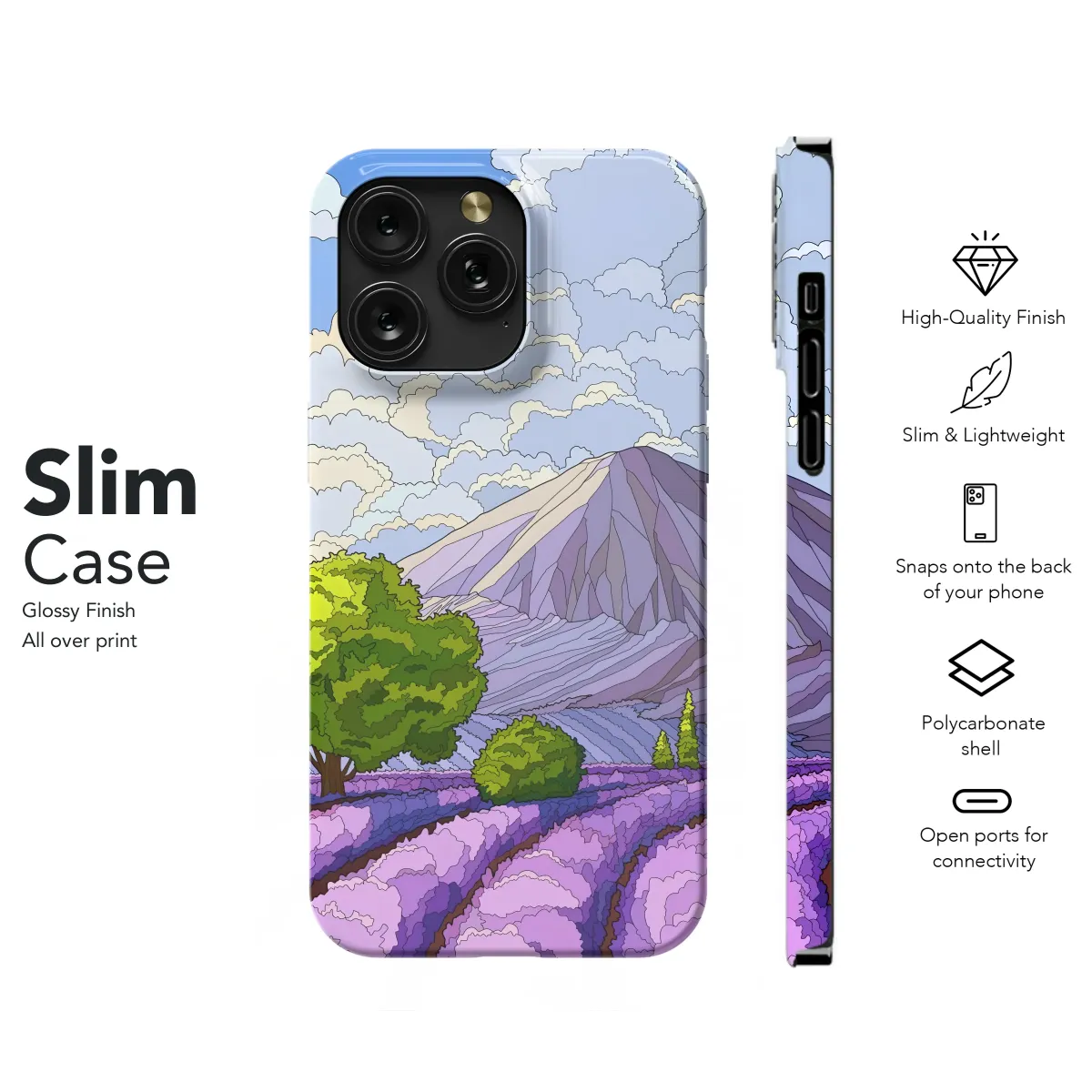 Elevate your style with this stunning lavender field design. Featuring a vibrant purple landscape against a backdrop of fluffy clouds and a majestic mountain, this artwork captures the serene beauty of nature. The intricate details and rich colors create a captivating visual that's both calming and sophisticated. This eye-catching design is perfect for adding a touch of tranquility and elegance to your personal accessory, making it a unique and memorable statement piece. The high-quality print ensures vibrant colors that won't fade, and the durable material provides long-lasting protection. Transform your everyday carry into a work of art with this nature-inspired design. This beautiful piece is ideal as a gift for nature lovers, art enthusiasts, or anyone seeking a touch of serenity. Express your individuality with this artistic, high-quality, and uniquely designed product. Add a touch of Provence to your life, showcasing this breathtaking landscape wherever you go. It's more than just a design; it's a captivating scene you can carry with you. Search terms: Lavender, purple, mountain, clouds, nature, landscape, field, floral, artistic, serene, elegant, Provence, art, design, gift.