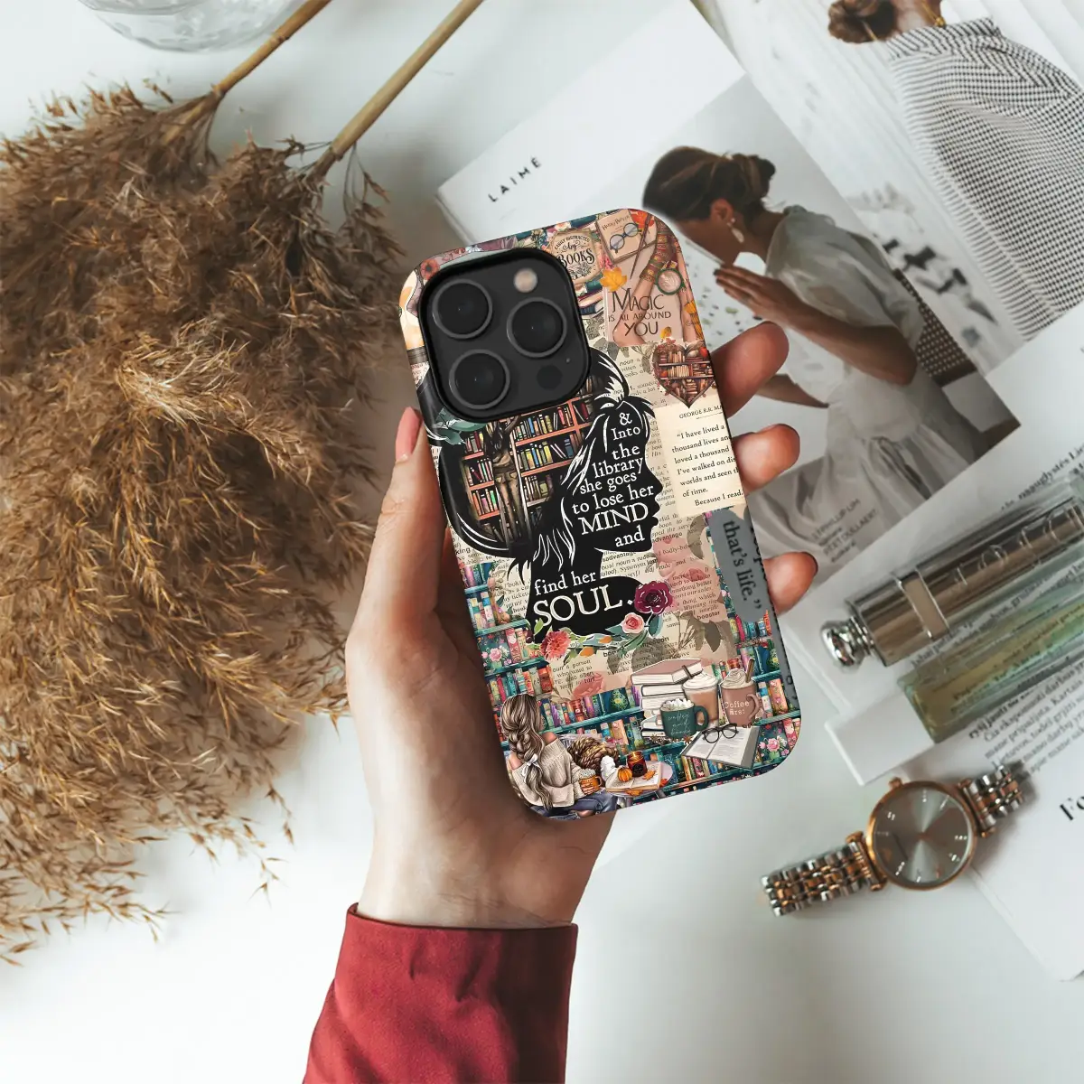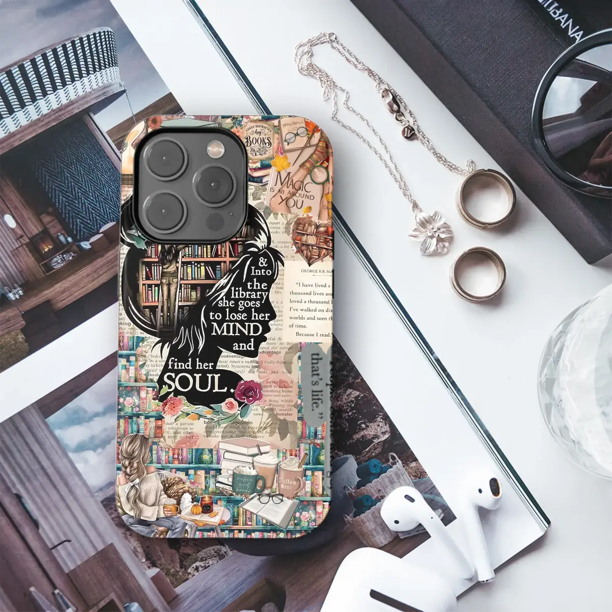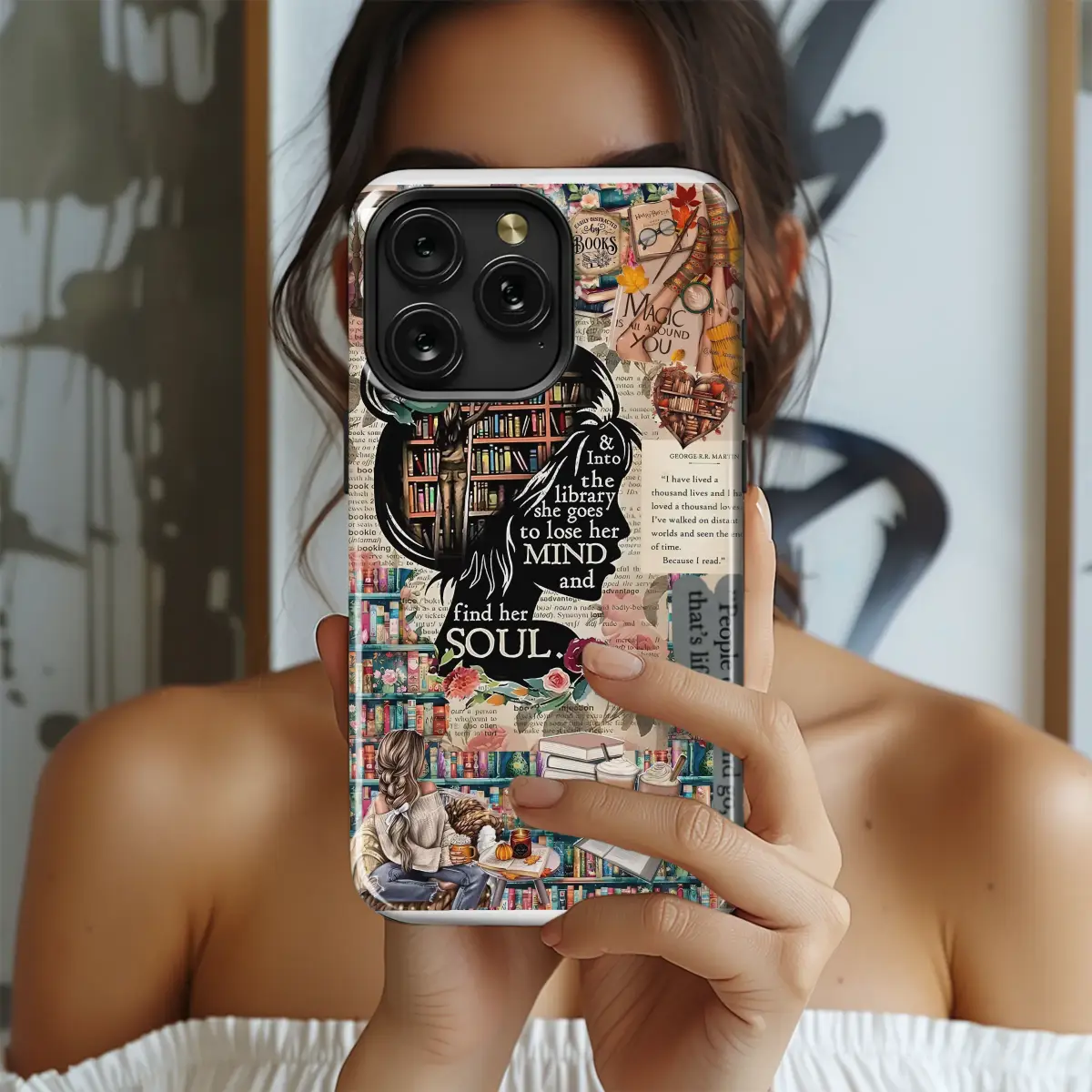 Celebrate your love for reading with this intricate literary collage. The design features a powerful quote, 'Into the library she goes to lose her mind and find her soul,' set against a backdrop of cozy library scenes, stacks of books, and warm autumnal details. It's a perfect artistic expression for any dedicated bookworm.