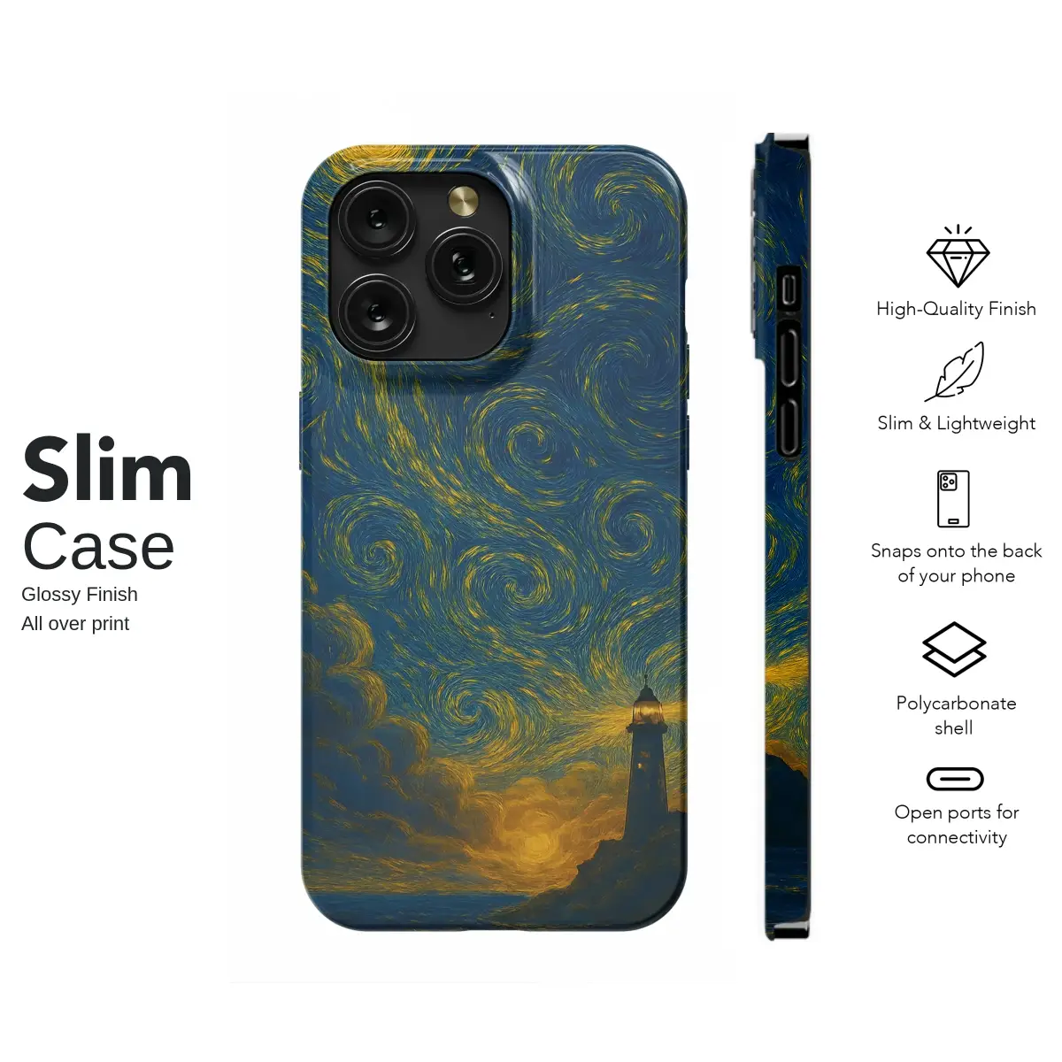 Inspired by the iconic work of post-impressionist masters, this design captures a dramatic coastal scene. A solitary lighthouse stands against a turbulent sea, while the night sky above erupts in a mesmerizing display of golden swirls and deep blues. The expressive, textured brushstrokes evoke a sense of movement and timeless artistic beauty.