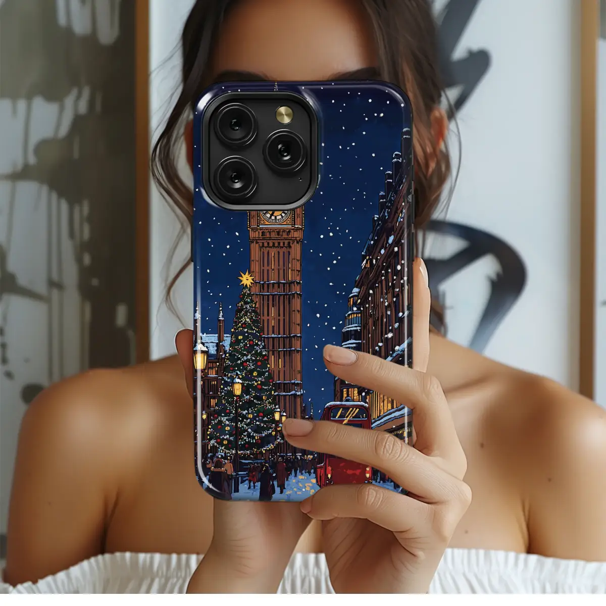 Capture the holiday magic with this illustrated London Christmas phone case. Our design features a charming, snowy city scene with the iconic Big Ben clock tower, a festive Christmas tree, and a classic red double-decker bus, perfect for adding a touch of winter wonder to your device. Inspired by the cozy feeling of a winter night in London, this case is a wonderful accessory for the festive season or a thoughtful gift for anyone who loves British culture and holiday cheer. Key Features: * Vibrant, durable UV-printed design * Slim, lightweight profile that's easy to hold * Made from flexible yet tough TPU silicone * Provides protection against minor bumps and scratches * Clear, open ports for easy connectivity * Supports wireless charging Available for a wide range of iPhone, Samsung Galaxy, and Google Pixel models. Please select your device from the dropdown menu. This case makes a fantastic stocking stuffer or holiday gift for travelers and anglophiles.