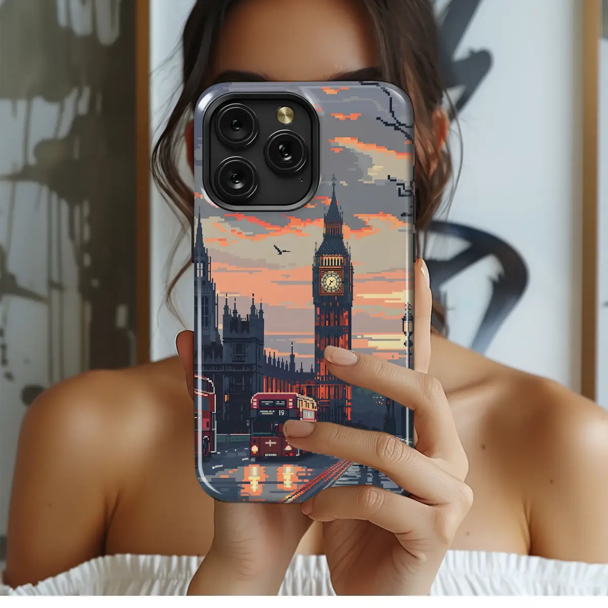 Showcase your unique style with this pixel art design featuring London's iconic clock tower and Houses of Parliament at sunset. The vibrant, 8-bit aesthetic captures the charm of a classic city scene, complete with iconic red double-decker buses and the glow of streetlights reflecting on a wet cobblestone street. This nostalgic and artistic print is perfect for adding a touch of British flair to your personal accessories. The detailed pixel art creates a retro vibe, while the warm sunset colors add a sense of tranquility and calm. This design makes a thoughtful gift for anyone who appreciates pixel art, travel, or British culture. Express yourself with this stylish and memorable piece, transforming your everyday item into a miniature work of art. The high-quality print ensures vivid colors and long-lasting durability, preserving the beauty of the design for years to come. This limited-edition design is sure to be a conversation starter, adding a personal touch of digital artistry to your belongings. Order yours today and bring a piece of London's charm with you wherever you go.