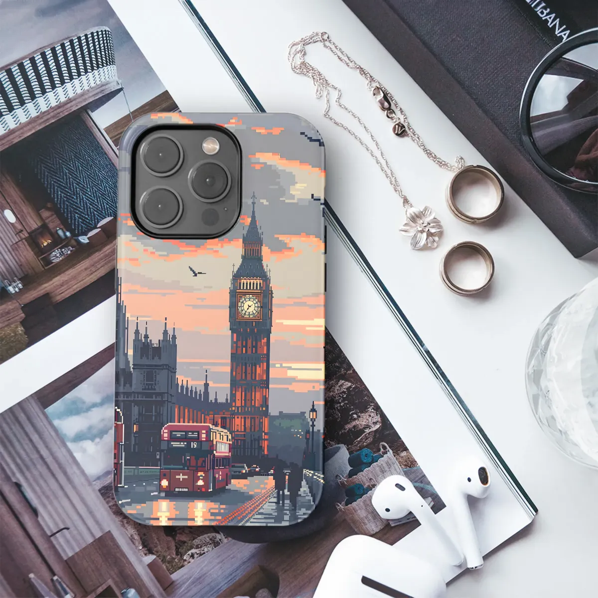 Showcase your unique style with this pixel art design featuring London's iconic clock tower and Houses of Parliament at sunset. The vibrant, 8-bit aesthetic captures the charm of a classic city scene, complete with iconic red double-decker buses and the glow of streetlights reflecting on a wet cobblestone street. This nostalgic and artistic print is perfect for adding a touch of British flair to your personal accessories. The detailed pixel art creates a retro vibe, while the warm sunset colors add a sense of tranquility and calm. This design makes a thoughtful gift for anyone who appreciates pixel art, travel, or British culture. Express yourself with this stylish and memorable piece, transforming your everyday item into a miniature work of art. The high-quality print ensures vivid colors and long-lasting durability, preserving the beauty of the design for years to come. This limited-edition design is sure to be a conversation starter, adding a personal touch of digital artistry to your belongings. Order yours today and bring a piece of London's charm with you wherever you go.
