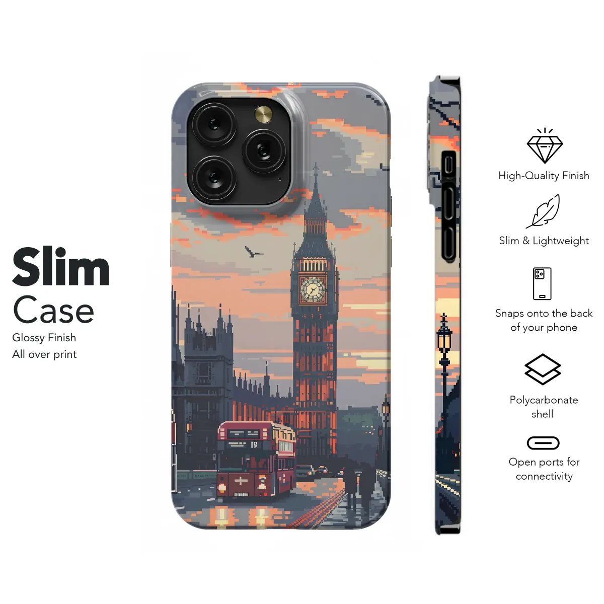 Showcase your unique style with this pixel art design featuring London's iconic clock tower and Houses of Parliament at sunset. The vibrant, 8-bit aesthetic captures the charm of a classic city scene, complete with iconic red double-decker buses and the glow of streetlights reflecting on a wet cobblestone street. This nostalgic and artistic print is perfect for adding a touch of British flair to your personal accessories. The detailed pixel art creates a retro vibe, while the warm sunset colors add a sense of tranquility and calm. This design makes a thoughtful gift for anyone who appreciates pixel art, travel, or British culture. Express yourself with this stylish and memorable piece, transforming your everyday item into a miniature work of art. The high-quality print ensures vivid colors and long-lasting durability, preserving the beauty of the design for years to come. This limited-edition design is sure to be a conversation starter, adding a personal touch of digital artistry to your belongings. Order yours today and bring a piece of London's charm with you wherever you go.