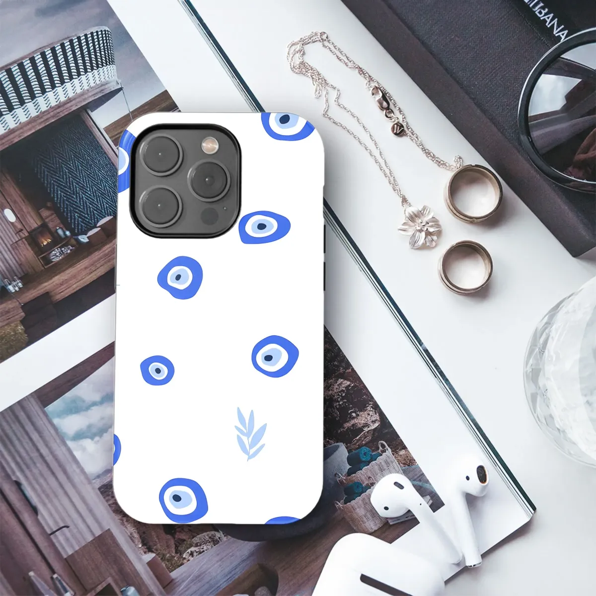 Experience the serene energy of our mystical evil eye pattern, a captivating blend of ancient symbolism and modern minimalist style. This seamless design features vibrant blue protective eyes scattered elegantly alongside delicate light blue leaves, all set against a crisp white background. The iconic Nazar symbol, steeped in centuries of tradition and belief, serves as a powerful talisman, warding off negative energy and bringing good fortune. Each evil eye is rendered with a unique, hand-drawn quality, adding an organic touch to the geometric form, while the subtle leaf motifs introduce a sense of natural calm and bohemian charm. This eye-catching arrangement creates a visually stunning print that is both spiritually significant and aesthetically pleasing. Perfect for adding a touch of protective energy and chic style to your everyday items, this exclusive digital pattern captures the essence of bohemian wanderlust and spiritual wellness. Embrace the protective gaze of this striking blue talisman, beautifully presented in a contemporary, easy-to-integrate artistic style. Whether seeking a personal amulet or simply drawn to the unique aesthetic, this captivating design offers a blend of cultural heritage and modern artistry. It’s a beautiful representation of protection and style, designed to bring a sense of peace and charm wherever you go, making your accessories uniquely yours with this spiritual print.