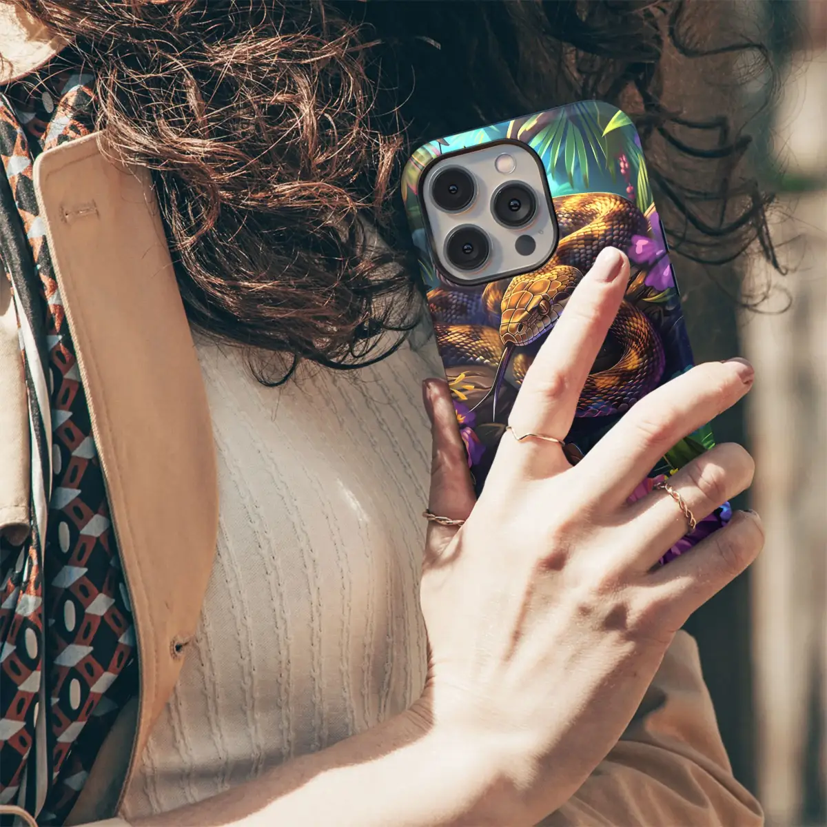 Immerse yourself in the captivating depths of the tropical wilderness with this striking digital illustration, a vivid piece showcasing the untamed beauty of nature and its inhabitants. A majestic serpent is depicted coiled gracefully and securely on a thick tree branch, its golden-brown scales shimmering with intricate detail and a subtle, earthy iridescence. The creature's focused gaze and quickly flicking forked tongue add a palpable sense of life, awareness, and intrigue to the serene yet powerful scene. Surrounding the coiled reptile is a lush tapestry of vibrant greenery, with large, glossy leaves and twisting vines creating a dense, mysterious, and rich backdrop. Brilliant bursts of intensely purple blooms, like exotic jewels, add dramatic pops of vivid color against the deep emerald green and cool blue tones of the jungle floor and the sun-dappled air above. These stylized tropical flowers, reminiscent of vibrant hibiscus or delicate orchids, enhance the enchanting, almost mystical atmosphere of the artwork. This detailed digital painting expertly captures the spirit of the wild jungle, combining the raw power and enigmatic grace of wildlife with the stunning beauty of tropical flora. It serves as a perfect statement design for anyone who appreciates bold nature art, serpentine symbolism, or the captivating allure of hidden jungle realms. This high-quality artistic graphic is rendered with exceptional resolution and rich, deep colors, making it an exceptional visual that truly stands out. Bring a touch of the exotic wilderness and its ancient energy into your everyday life with this truly unique and eye-catching creation. It’s an ideal choice for anyone seeking a distinctive art piece to adorn their personal items, offering a splash of vibrant, wild nature and ancient animalistic charm that sparks conversation.