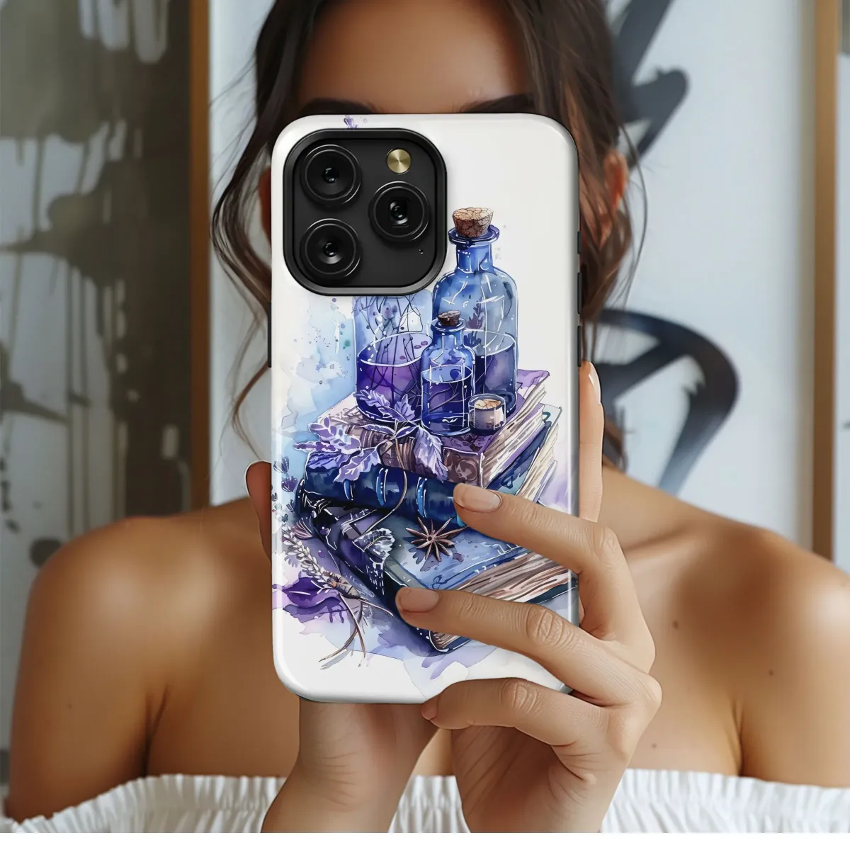 Step into a world of ancient knowledge and mystical charm with this enchanting watercolor artwork. This intricate design features a captivating stack of aged volumes, their worn covers hinting at countless stories within, pages filled with forgotten lore and secrets waiting to be discovered. Perched atop these timeless texts are beautiful blue glass bottles, some corked, filled with ethereal liquids, perhaps elixirs or potent potions brewed under a moonlit sky. Delicate sprigs of dried lavender, known for its calming properties and mystical associations, intertwine gracefully with the scene, their purple blossoms adding a touch of natural beauty. Alongside, the distinctive shape and fragrant allure of star anise rests, adding a subtle hint of celestial spice and earthy magic. The artwork is meticulously rendered in a stunning watercolor technique, with rich washes of deep indigo, vibrant violet, and soft blues blending seamlessly, creating a dreamy, atmospheric effect complemented by subtle paint splatters that add character and texture. This design evokes a sense of dark academia meets cottagecore whimsy, blending scholarly pursuits with natural elements and a hint of the occult. It's perfect for anyone drawn to the aesthetics of magic, nature, history, or fantasy, offering a truly unique piece of botanical and apothecary inspired illustration. Ideal for bringing a touch of enchanting beauty to your everyday items, this mystical illustration is a conversation starter and a reflection of your personal style. Whether you're a practicing witch, a lover of vintage aesthetics, a history buff, or simply appreciate unique artistic expressions, this design offers a captivating glimpse into a world of spellbinding wonder. It’s more than just an image; it’s a portal to a hidden realm, a perfect gift for book enthusiasts, nature lovers, and seekers of the extraordinary. Embrace the magic and mystery captured in this handcrafted style artwork and let it inspire your day. This unique art print adds a touch of old-world charm and spiritual depth wherever it goes.