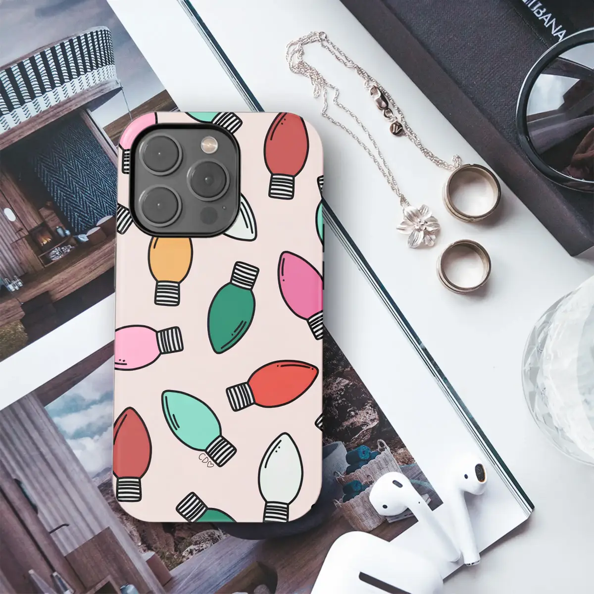 Illuminate your everyday with a touch of whimsical holiday nostalgia. This delightful design features a scattered pattern of vintage-inspired Christmas bulbs, glowing in cheerful shades of candy pink, mint green, festive red, and sunny yellow against a soft, rosy background. The hand-drawn quality and subtle texture give it a cozy, retro charm that feels both modern and timeless. This isn't just a pattern; it's a feeling—a throwback to cherished memories of decorating the tree, the warm twinkle of lights on a snowy evening, and the pure, simple joy of the holiday season. Let this cheerful artwork wrap your most-used accessory in a blanket of festive spirit, making every glance a reminder to be merry and bright. It’s the perfect way to carry a little piece of holiday magic with you, sparking conversations and smiles wherever you go. An ideal aesthetic for anyone who loves a cute, vintage vibe or wants to infuse their winter with a pop of joyful color and classic holiday cheer.