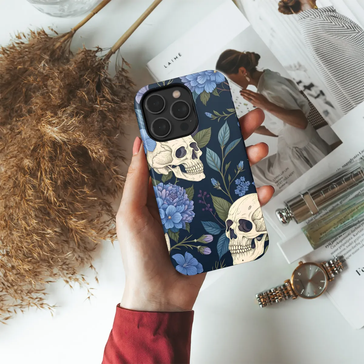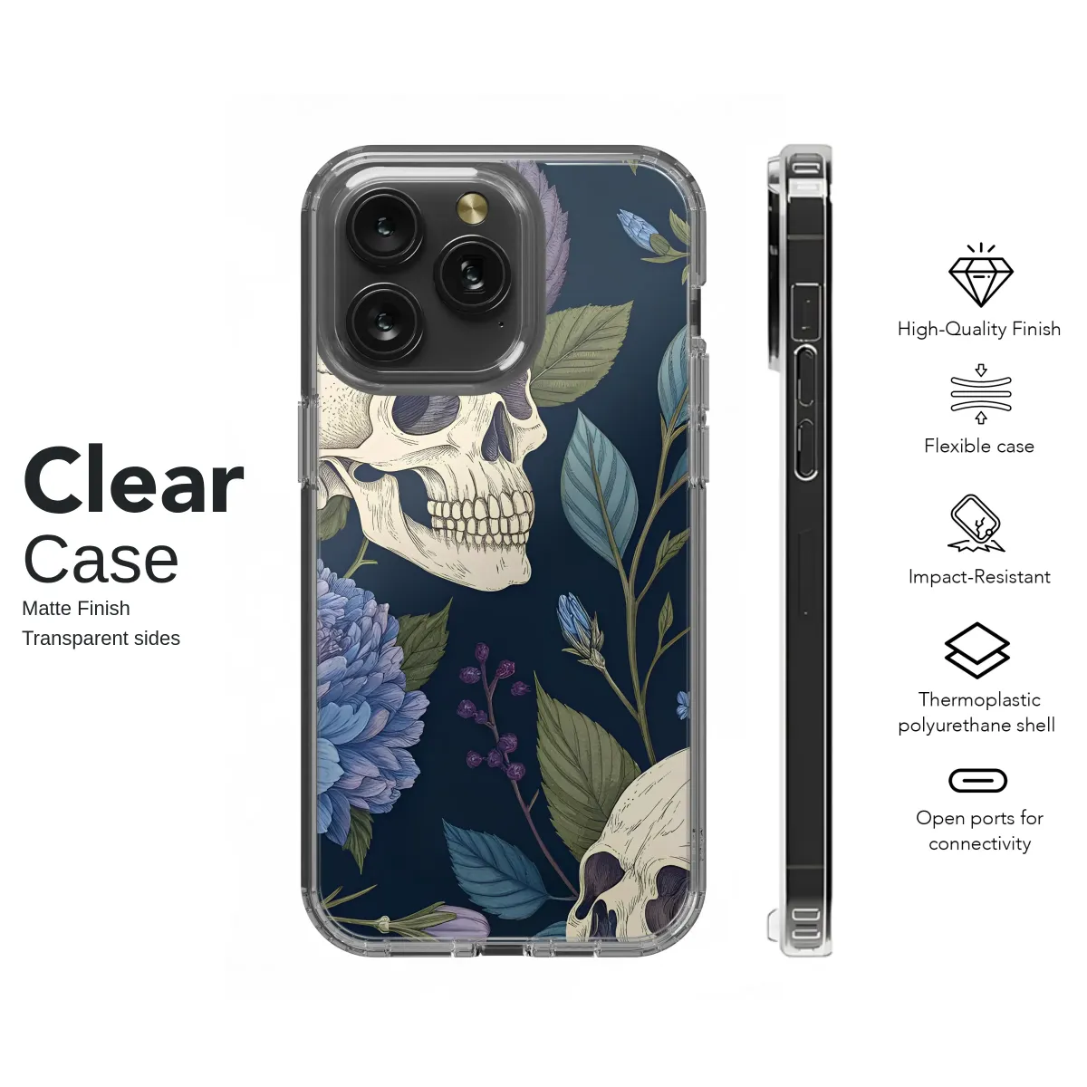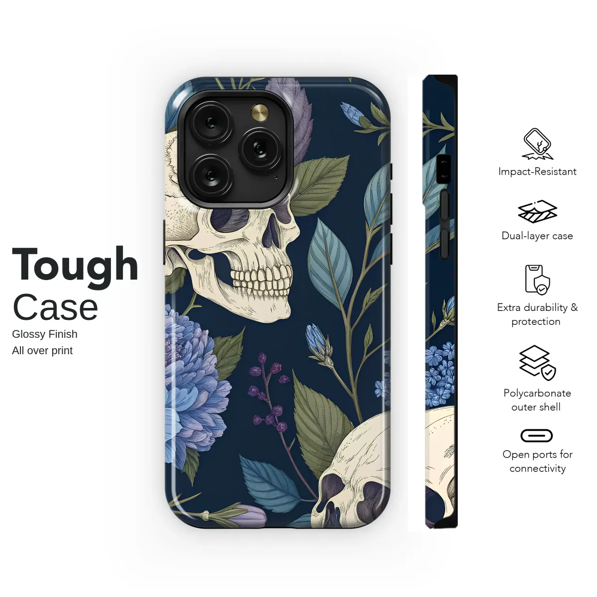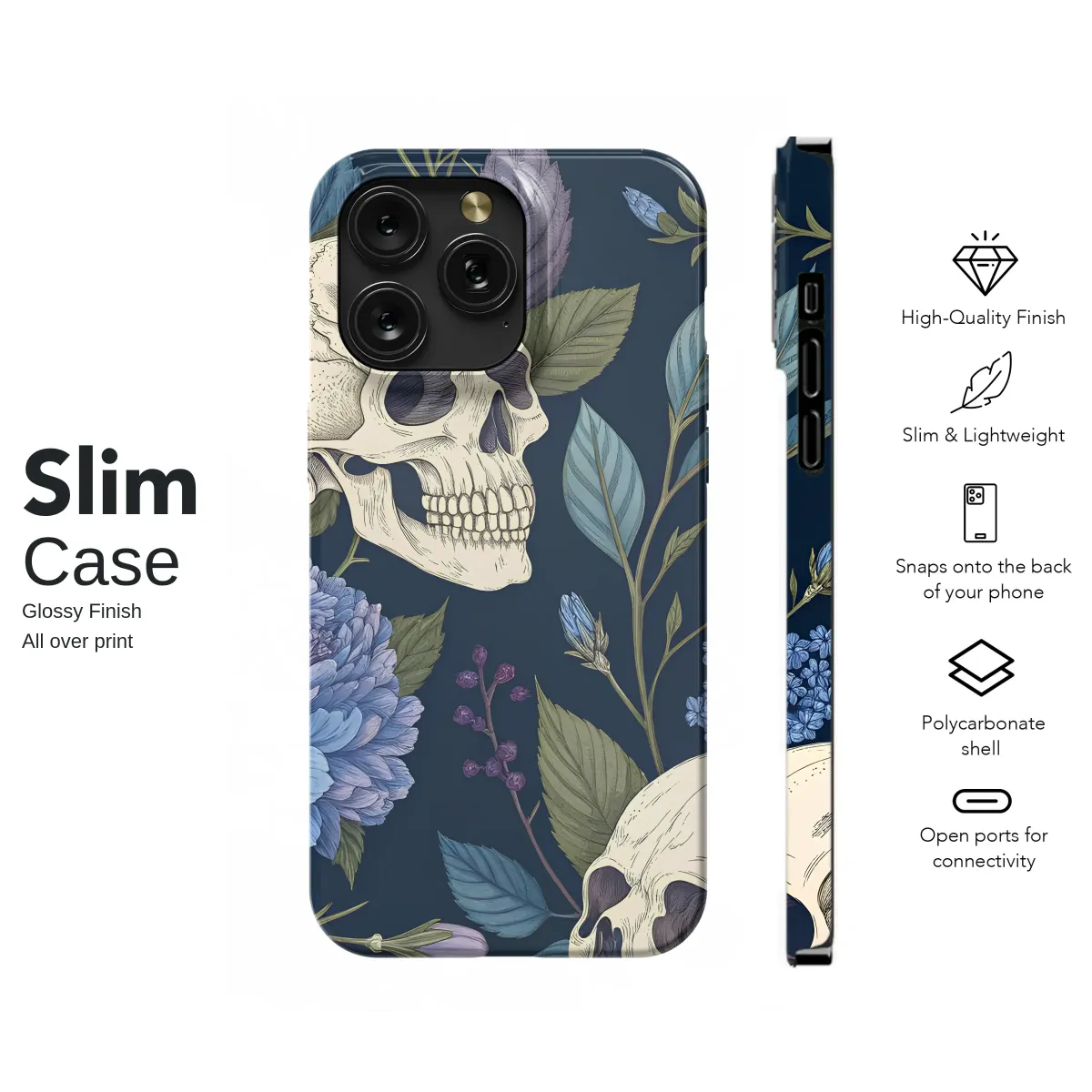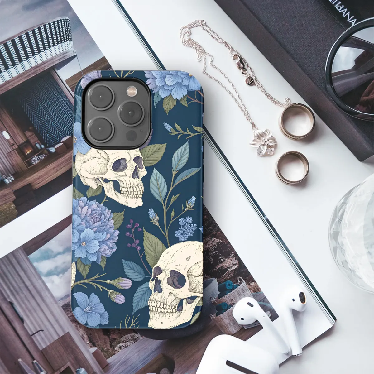 Step into a secret, moonlit garden where beauty and mortality entwine in a delicate, eternal dance. Upon a deep midnight navy canvas, intricately detailed ivory skulls rest among a tapestry of lush, blooming flora. This moody floral design captures a stunning contrast, celebrating the haunting allure of life's cycle with whispers of cornflower blue, deep periwinkle, and soft lavender unfolding in delicate petals and twisting vines. It’s a piece of wearable art that speaks to a soul who appreciates Dark Academia aesthetics and the enchanting mystery of Cottagegoth style. Perfect for the modern romantic, the witchy spirit, or the lover of macabre art, this vintage botanical illustration transforms your most essential everyday companion into an exquisite statement piece. Let this captivating Memento Mori serve as your personal armor, a touch of gothic elegance that protects your connection to the world while telling a story of beautiful decay. It’s a unique and thoughtful gift for anyone who finds romance in the shadows, allowing them to carry a fragment of a forgotten fairytale wherever they wander. This isn't just an accessory; it's a conversation starter, a sliver of dark and dreamy art you can hold in your hand.