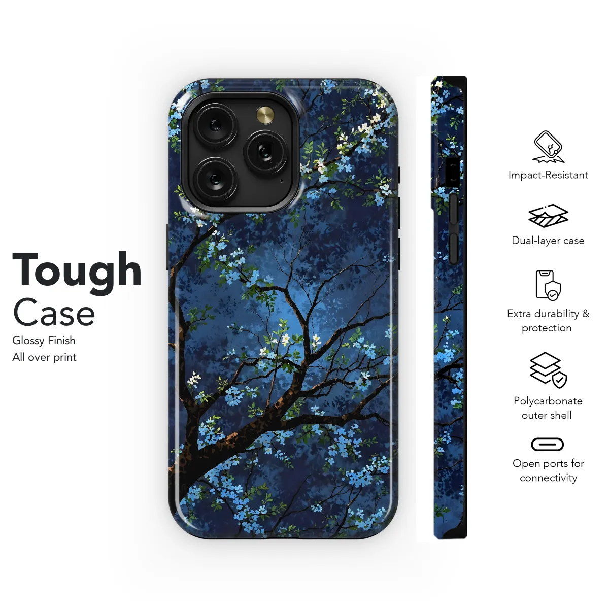 Immerse your phone in the enchanting beauty of the Midnight Blossom Tree. This ethereal phone case transforms your device into a captivating work of art, featuring intricate floral designs against a deep and enigmatic backdrop. With its premium protection, this case safeguards your precious phone from the elements while adding a touch of celestial charm to your daily routine.
