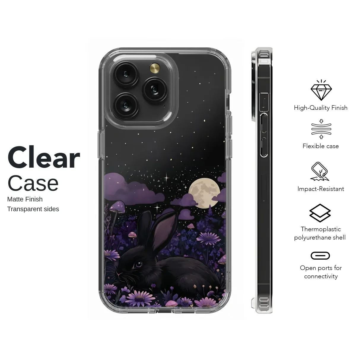 Embrace the enchanting allure of this mystical design, featuring a captivating black rabbit nestled amongst a field of vibrant purple flowers under a mesmerizing full moon. Delicate mushrooms and twinkling stars complete this dreamy nocturnal scene, perfect for adding a touch of whimsical magic to your everyday life. The rich, dark color palette and intricate details create a truly unique and captivating aesthetic, ideal for those who appreciate gothic, dark academia, or fantasy styles. This stunning artwork transforms your accessory into a miniature work of art, expressing your individuality with subtle elegance. Its high-resolution print ensures vibrant and long-lasting color, preserving the detail and beauty of the original artwork. Show off your unique personality with this expressive design, a conversation starter that blends artistry and functionality seamlessly. This artistic accessory is sure to receive compliments and admiration. Suitable for gifting or treating yourself, this piece makes a truly unforgettable statement. Find your magical escape, one accessory at a time.