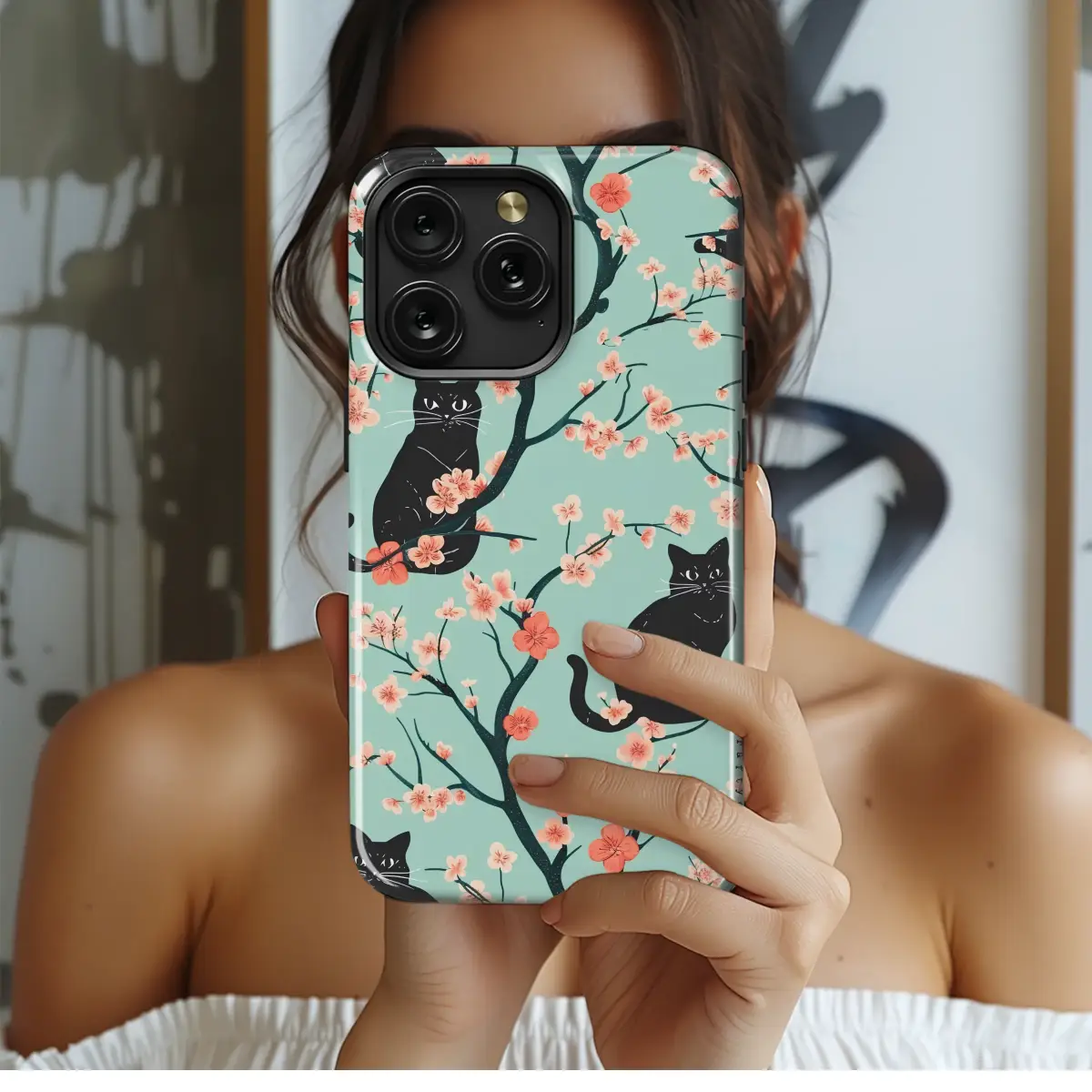 Step into a tranquil, moonlit garden where elegant black cats perch silently among blooming cherry blossom branches. This enchanting design captures a serene moment, blending the mysterious allure of midnight felines with the delicate beauty of spring. Each velvety silhouette is a study in quiet grace, their watchful eyes gleaming amidst a cascade of soft pink and vibrant coral sakura petals. The cool, mint-teal backdrop creates a stunning contrast, making the dark branches and vivid blossoms pop with life, evoking the fresh, hopeful feeling of a new season. This artwork is a celebration of nature's quiet magic and the playful spirit of our beloved animal companions. Perfect for any cat lover or admirer of Japanese-inspired floral art, this design transforms your everyday essentials into a piece of wearable whimsy. Carry a whisper of spring and the charm of a hidden garden with you, adding a touch of sophisticated, artistic flair to your daily routine. It's an ideal gift for anyone who appreciates unique illustrations and the timeless connection between nature and fantasy.