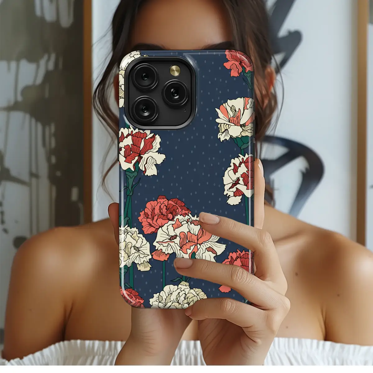 Immerse yourself in the quiet elegance of a twilight garden with this captivating botanical design, a perfect artistic touch for your favorite accessory. Set against a deep, midnight navy canvas, delicate polka dots scatter like faint stars, creating a dreamy, atmospheric backdrop for the stunning floral display. From this rich stage, a stunning array of carnations unfurls in full bloom, each one a masterpiece of detailed illustration. Bold, artistic lines define the delicate, ruffled petals in a sophisticated palette of creamy ivory, soft off-white, and a vibrant coral red that provides a beautiful pop of color. The slender, dark green stems anchor the blossoms, adding a touch of lifelike grace and movement to the overall composition. This design is a beautiful fusion of vintage floral aesthetics and contemporary artistry, whispering tales of secret gardens and timeless romance. It's the perfect way to infuse your daily life with artistic flair, transforming your daily essential into a true statement piece. Let this elegant floral pattern envelop your device in beauty, showcasing your unique style. It’s a thoughtful gift for any nature lover, art enthusiast, or anyone who appreciates the enduring charm of botanical illustrations. Carry a pocketful of poetry and let this exquisite design be a daily reminder of nature's delicate artistry.