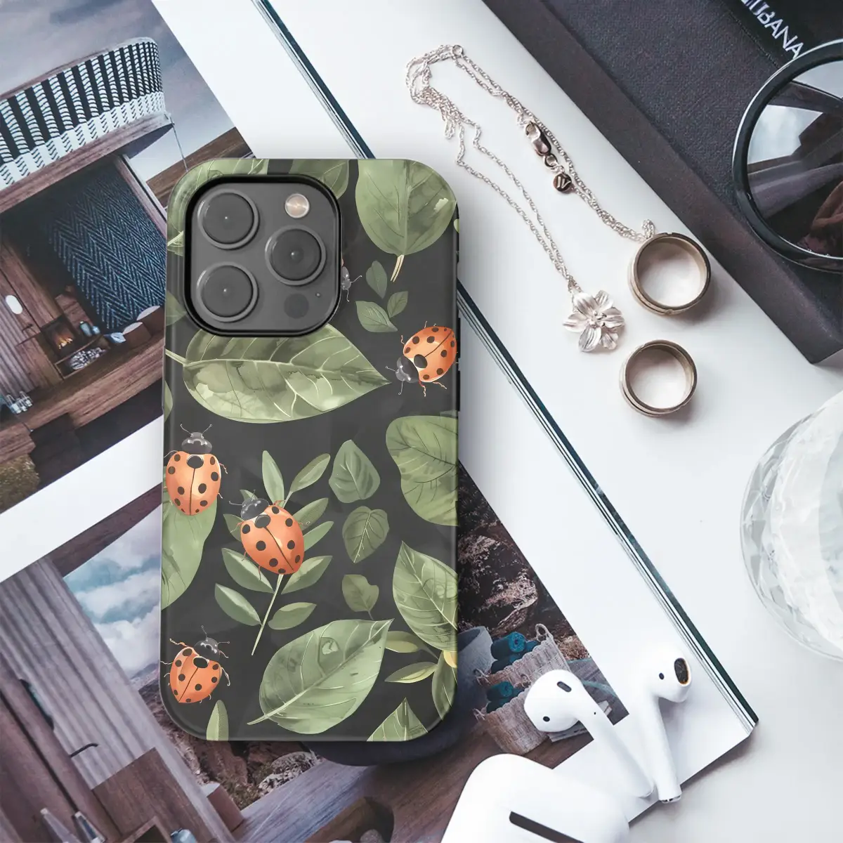 Step into the serene magic of an enchanted midnight garden with this captivating botanical design. Imagine tiny, vibrant crimson ladybugs—timeless symbols of good luck and delight—fluttering and crawling across a lush tapestry of emerald, sage, and olive green leaves. Each leaf is rendered with exquisite, watercolor-like detail, its delicate veins and soft textures glowing against a deep, velvety black backdrop that makes the entire scene pop with dramatic life. This whimsical pattern evokes the quiet magic of a hidden forest floor after a spring rain, a perfect slice of cottagecore charm and forestcore elegance for your most-used accessory. It’s more than just a beautiful illustration; it's a tiny, wearable world that brings a touch of nature’s serenity and a whisper of good fortune to your everyday life. This moody botanical artwork is an ideal gift for the dreamer, the dedicated gardener, or any nature lover who finds profound joy in the small wonders of the world. Let this enchanting ladybug pattern infuse your daily routine with a sense of whimsical style and a constant, beautiful reminder of luck.