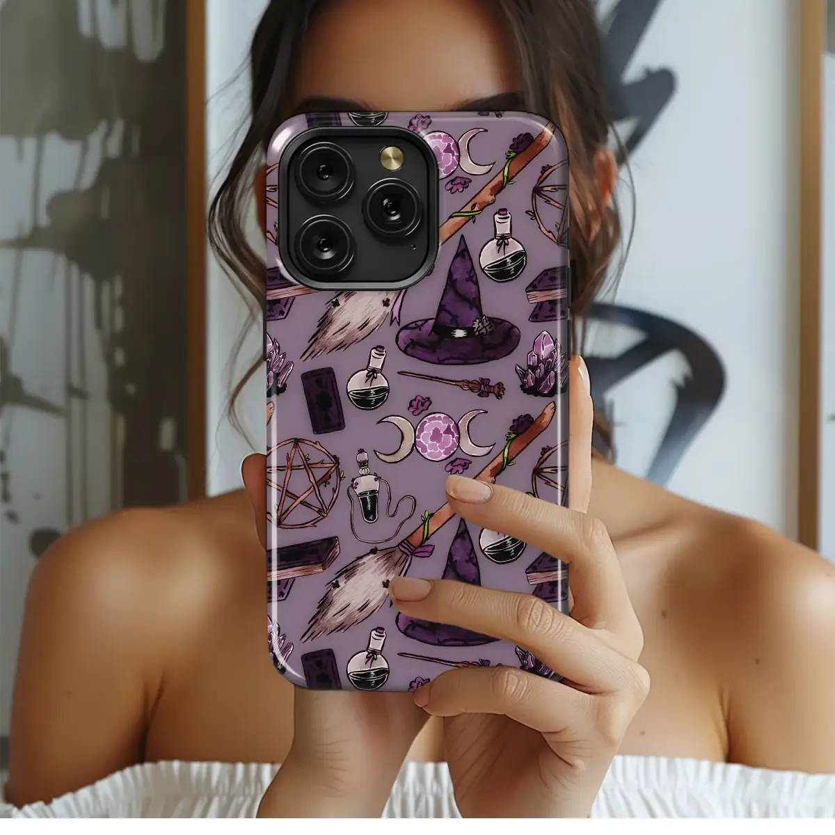 Step into a world whispered in shades of amethyst and twilight, where magic is woven into the very fabric of the everyday. This intricate design captures the quiet power of a witch's sacred space, featuring hand-drawn illustrations of essential mystical tools. Discover a vine-wrapped broomstick ready for flight, a pointed hat steeped in ancient lore, and a rustic pentagram calling upon the elements. Glimmering amethyst crystals pulse with energy beside corked glass vials filled with mysterious potions. An old spellbook, its pages filled with forgotten secrets, rests near a powerful triple moon symbol, celebrating the phases of divine feminine energy. The delicate watercolor style, with its deep purples and earthy tones, creates a sense of handmade charm and authentic magic. This isn't just a pattern; it's a portable altar, a tribute to the cottage witch and the dark academia scholar. Let this captivating artwork serve as your daily talisman, a beautiful and durable shield for your modern grimoire, infusing your routine with enchantment and personal power. Carry the sacred symbols of your craft with you, a constant reminder of the magic that resides both in the world and within yourself.