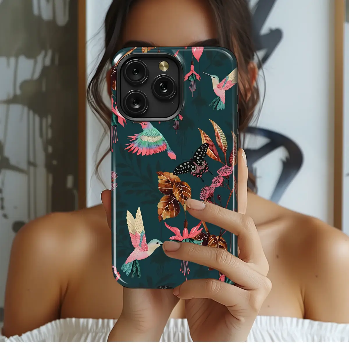 Immerse yourself in the enchanting allure of a secret midnight garden, a world captured in stunning artistic detail. This captivating design is a portal to a hidden paradise where jewel-toned hummingbirds, their wings a dazzling rainbow gradient, flit and hover with delicate grace. They dance among exquisite, lantern-like fuchsia blossoms, painted in breathtaking shades of vibrant magenta and cool, mysterious teal. The entire scene unfolds against a deep, moody green backdrop, creating a dramatic canvas that makes every color pop with life. Notice the intricate details: the spotted butterfly fluttering past, the warm, coppery tones of the autumn leaves, and the subtle shadows that add depth to this magical ecosystem. This artwork is more than just a beautiful pattern; it’s an emotional escape, a wearable piece of art that speaks to the soul of the nature lover and the dreamer. It’s for those who find wonder in the wild and seek to carry a piece of that magic with them. Let this stunning botanical scene transform your everyday essential into a statement of personal style and a celebration of nature's unparalleled artistry. It makes a truly unique and thoughtful gift for anyone who appreciates whimsical illustrations and the timeless beauty of a floral paradise.