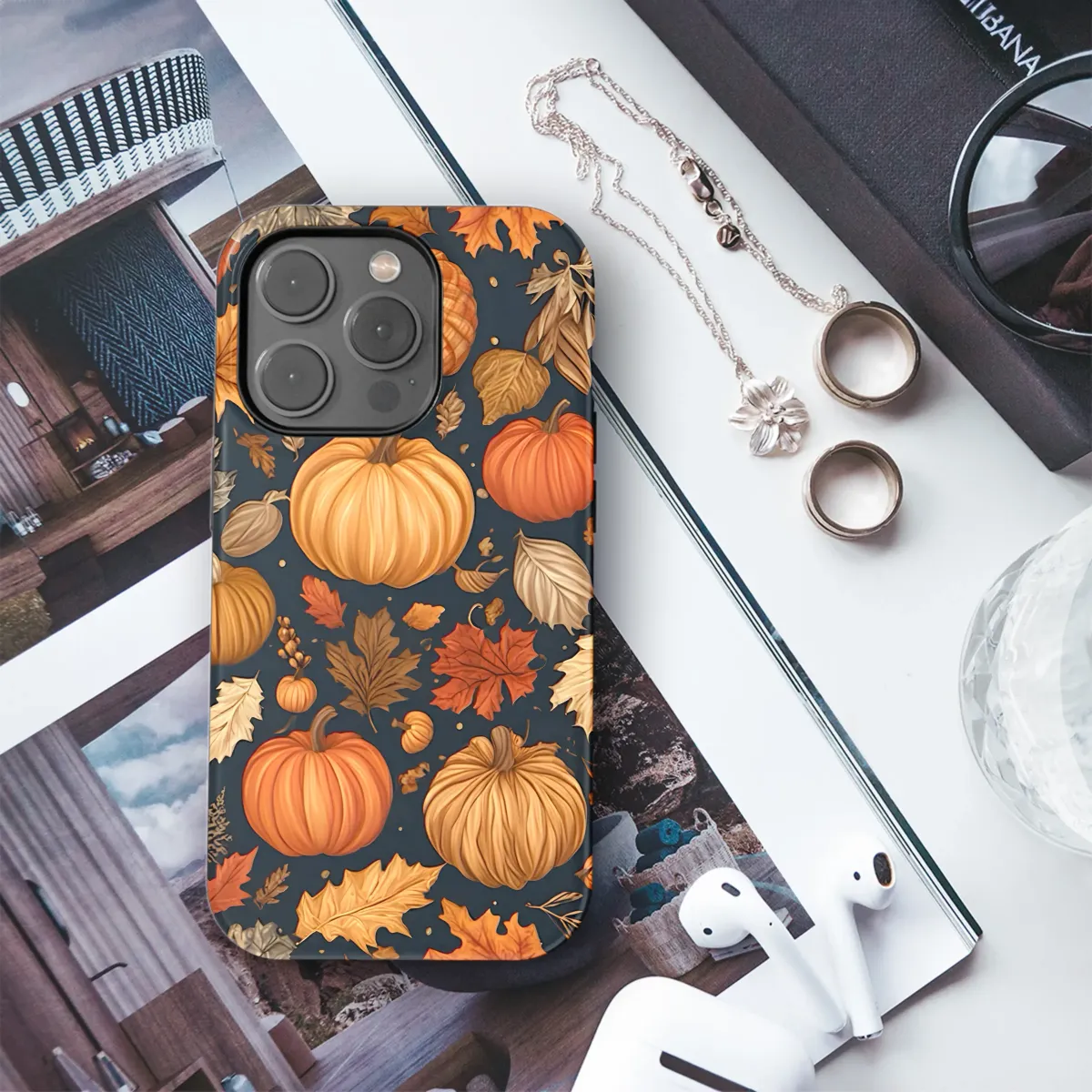 Embrace the enchanting spirit of autumn with a design that captures the very essence of a crisp, midnight harvest. This isn't just a pattern; it's a portal to your favorite season, wrapping your most-used essential in a tapestry of fall magic. Imagine a moonlit stroll through a pumpkin patch, the air filled with the scent of earthy leaves and sweet spice. Our artwork brings this moment to life with a stunning array of vibrant pumpkins, from deep oranges to warm, plaid-textured gourds, all nestled amongst a cascade of falling leaves. Each leaf is detailed in rich shades of ochre, deep crimson, and rustic brown, creating a breathtaking contrast against the dark, mysterious background. This design is a celebration of all things cozy and nostalgic—perfect for the lover of sweater weather, warm drinks, and the comforting glow of a crackling fire. It's an ideal companion for your fall adventures, from hayrides and corn mazes to quiet evenings spent with a good book. Let this piece of art be a constant, beautiful reminder of the harvest season, adding a touch of rustic elegance and seasonal charm to your daily life. It’s your personal slice of autumn, ready to accompany you through spooky season, Thanksgiving feasts, and every cozy moment in between.