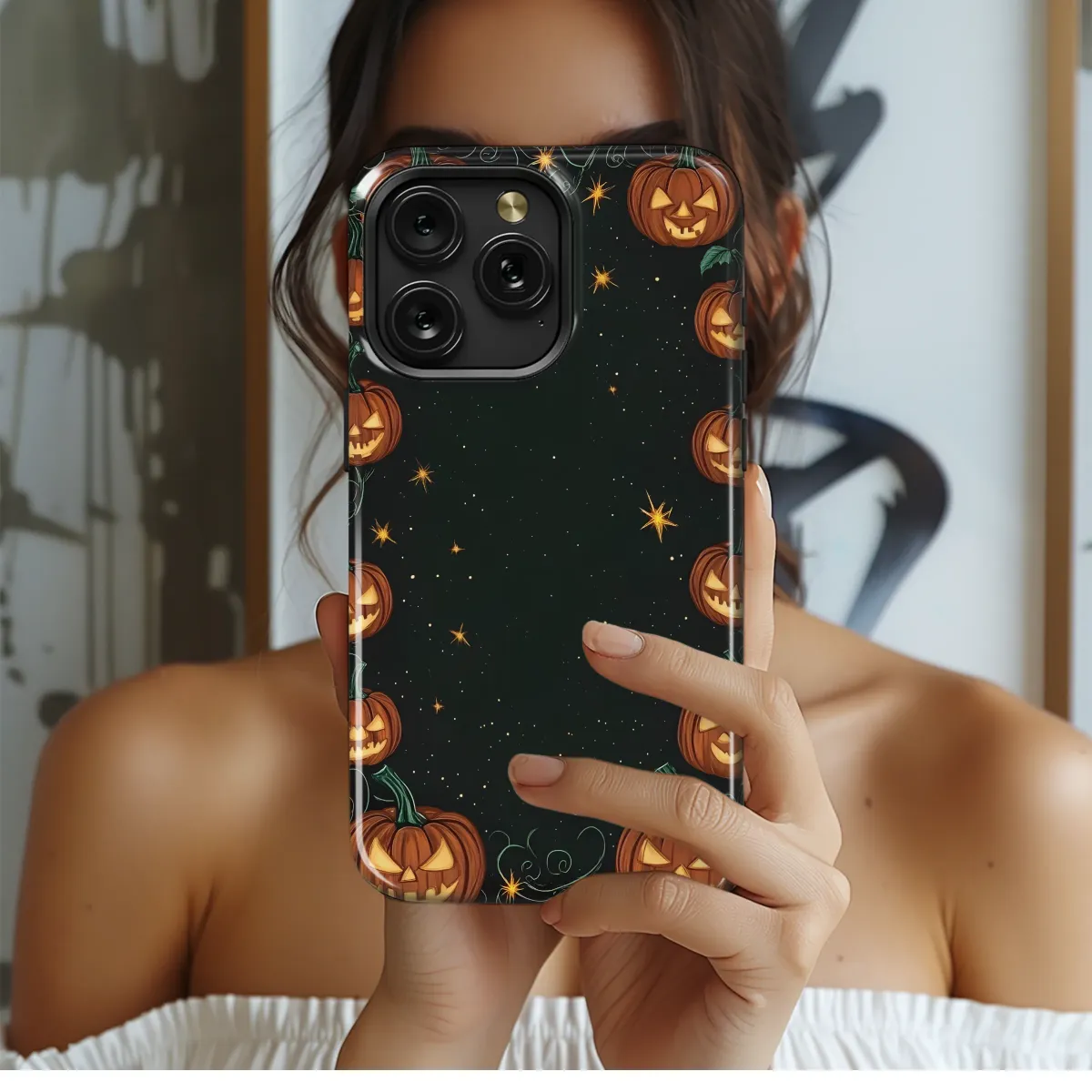 Immerse yourself in the heart of autumn with this captivating artwork, a perfect tribute to the most magical season. Picture yourself on a cool, crisp night, wandering through a secret pumpkin patch where the veil between worlds is thin. Under a vast, starlit sky, a frame of mischievous jack-o'-lanterns comes to life, their carved smiles and wicked eyes radiating a warm, bewitching glow. Each pumpkin, connected by twisting, dark green vines, seems to share a happy secret, their light twinkling in harmony with the distant stars scattered across the deep indigo heavens. This design is an ode to spooky season, blending a gothic aesthetic with whimsical, cottagecore charm. It’s for the souls who find comfort in the autumn chill, who love the scent of fallen leaves, and who believe in the magic of Halloween night. Carry this piece of the haunted harvest with you, a personal accessory that not only protects your essentials but also showcases your love for all things mystical and festive. It's a statement of style, a fragment of a dark fairytale, and a constant reminder of the enchanting, spooky joy that lives in the heart of fall.