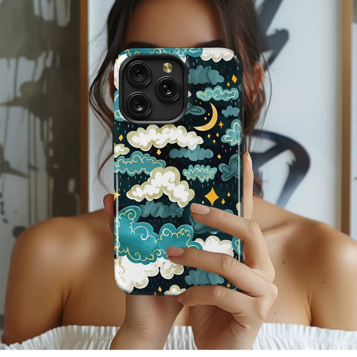 Embrace the quiet magic of a rainy midnight sky, a moment captured where dreams are woven between the clouds and stars. This enchanting celestial design invites you into a whimsical dreamscape, where painterly clouds drift across a deep, textured navy canvas. Painted in a rich palette of moody teal, stormy blue, and soft, creamy white, each cloud is kissed with delicate golden outlines that shimmer like captured starlight, adding a touch of luxury and warmth to the cool night scene. A gentle crescent moon hangs peacefully, a serene anchor in the cosmic dance, while brilliant diamond-shaped stars twinkle brightly against the atmospheric backdrop. A soft, painterly rain falls gently, not with sadness, but with a sense of cozy tranquility and renewal. This unique, artist-designed piece is perfect for the romantic soul, the stargazer, and anyone who appreciates a dark academia or cottagecore aesthetic. It’s a design that evokes the feeling of quiet evenings with a good book, the soothing patter of rainfall on a windowpane, and the profound wonder of looking up at the cosmos. Let this miniature work of art infuse your daily life with celestial serenity and bohemian charm, a constant reminder of the magic that exists just above the clouds.