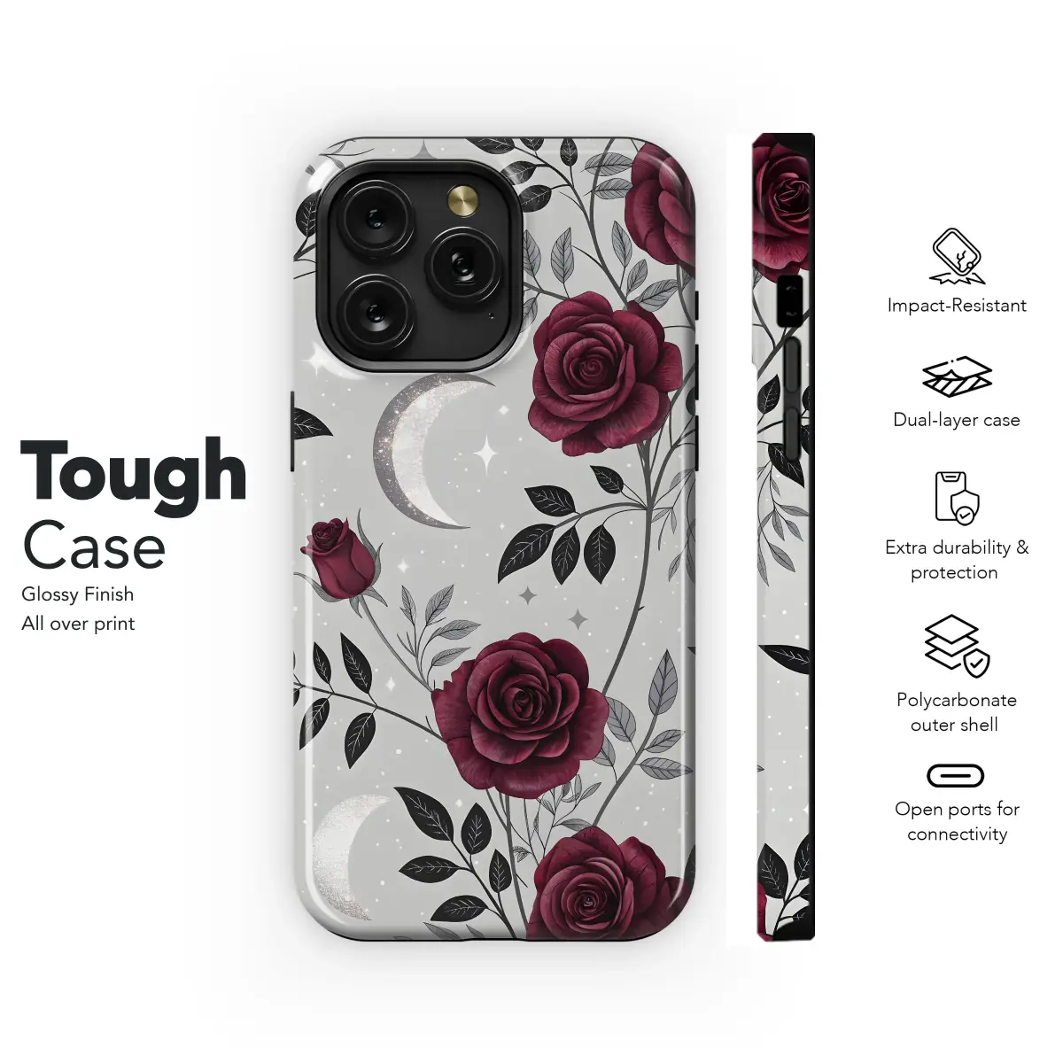 Cloak your most essential tech in the enchanting mystery of a celestial midnight garden with this breathtaking gothic floral design. Imagine velvety, deep burgundy roses, the color of rich Merlot wine, blooming in the twilight, their romantic petals a stark, beautiful contrast to the shadowy black and silver-grey leaves winding around them on thorny vines. A brilliant silver crescent moon, dusted with a fine, ethereal glitter, hangs in the serene sky, casting its magical glow upon a scattering of twinkling stars. This isn't just a pattern; it's a piece of wearable art that speaks of dark romance, witchy aesthetics, and a love for all things mystical. Perfect for expressing your unique dark academia or whimsigoth style, this beautiful protective art transforms your daily companion into a personal talisman. It’s an unforgettable and unique gift for the modern witch, the bookish romantic, or anyone who finds profound beauty in the moonlit dark. Let this moody botanical scene be the armor for your everyday magic, a constant reminder of the beauty that blossoms in the shadows.