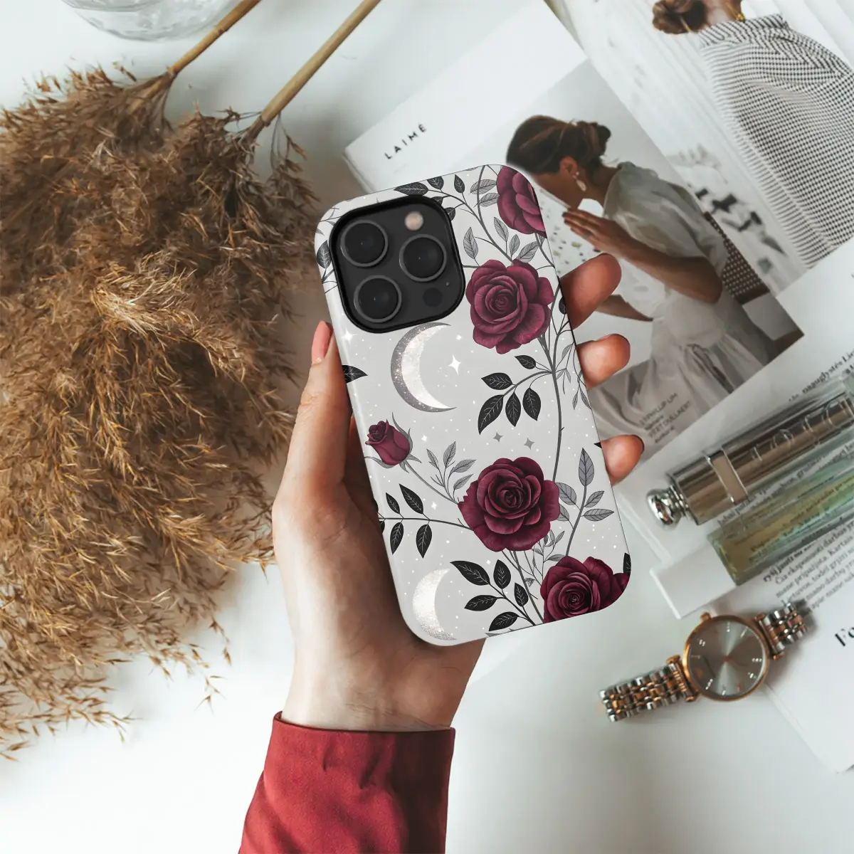 Cloak your most essential tech in the enchanting mystery of a celestial midnight garden with this breathtaking gothic floral design. Imagine velvety, deep burgundy roses, the color of rich Merlot wine, blooming in the twilight, their romantic petals a stark, beautiful contrast to the shadowy black and silver-grey leaves winding around them on thorny vines. A brilliant silver crescent moon, dusted with a fine, ethereal glitter, hangs in the serene sky, casting its magical glow upon a scattering of twinkling stars. This isn't just a pattern; it's a piece of wearable art that speaks of dark romance, witchy aesthetics, and a love for all things mystical. Perfect for expressing your unique dark academia or whimsigoth style, this beautiful protective art transforms your daily companion into a personal talisman. It’s an unforgettable and unique gift for the modern witch, the bookish romantic, or anyone who finds profound beauty in the moonlit dark. Let this moody botanical scene be the armor for your everyday magic, a constant reminder of the beauty that blossoms in the shadows.