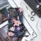 Immerse yourself in a lush, dark floral paradise with this captivating pattern, a perfect blend of tropical beauty and bohemian romance. The design features a dramatic black background creating a stunning contrast for the vibrant botanical elements. Delicate pink lilies, their petals dusted with subtle speckles, are artfully arranged alongside clusters of deep indigo and vibrant blue blooms, bringing to mind exotic pansies and other captivating garden flowers. Adding to the visual richness, sprays of delicate purple florets, much like lavender, punctuate the design. Lush foliage in shades of deep teal, sapphire blue, and hints of burgundy intertwines throughout, adding layers and organic texture to this vibrant botanical illustration. This exquisite print is more than just a pattern; it's an artistic expression, evoking a sense of mystery, elegance, and connection to nature. It's a bold statement piece, ideal for those who appreciate unique art and want to infuse their everyday with color and style. Perfect for enhancing a beloved personal item, this beautiful design is a conversation starter and a constant source of visual delight. Embrace the allure of this dark floral aesthetic, a versatile print that complements various styles and adds a touch of sophistication. It’s a truly special and eye-catching design, making it a wonderful artistic choice or a thoughtful gift for someone who loves flowers and bold patterns. Explore the intricate beauty and rich colors of this unique floral tapestry.