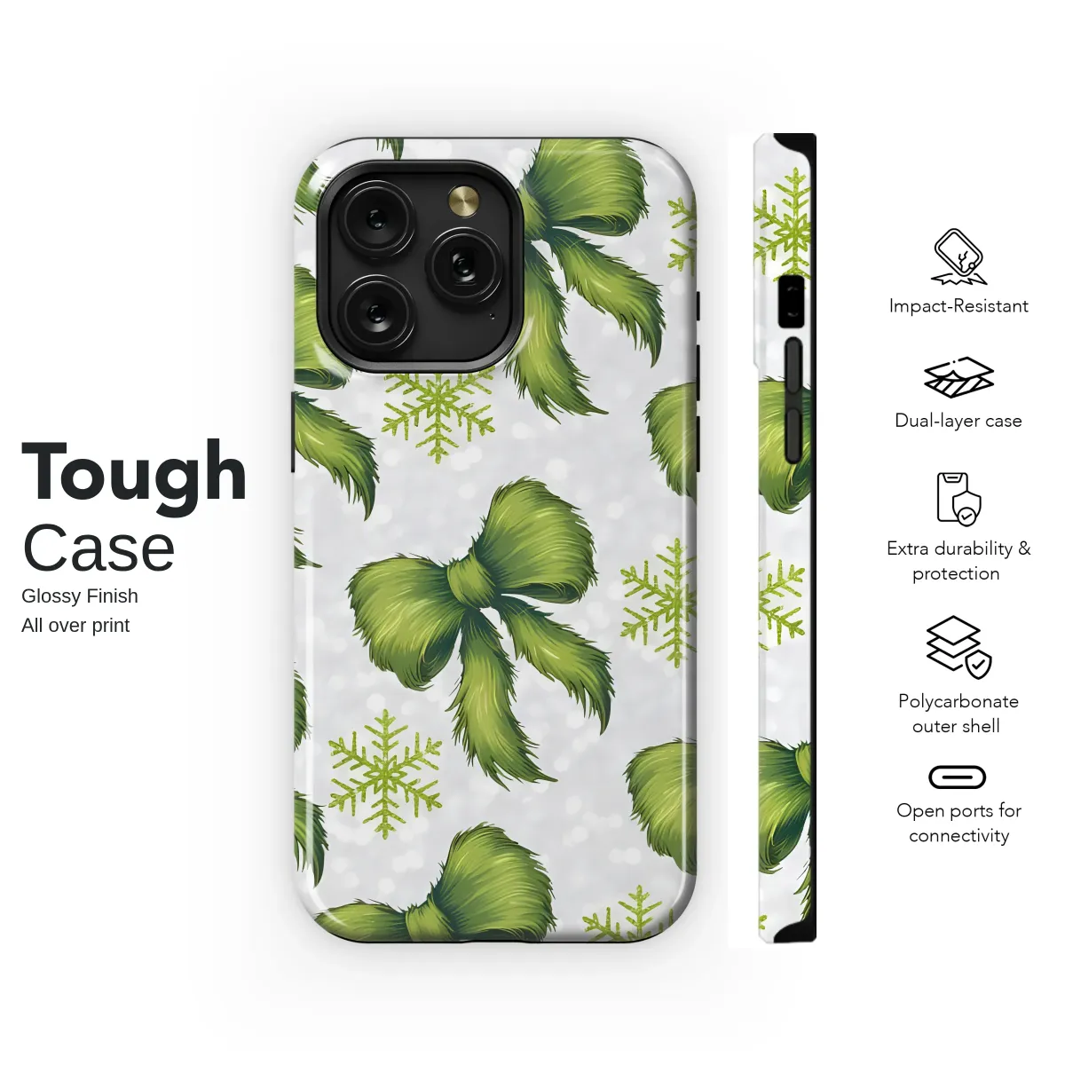 Embrace the playful side of the season with this enchanting holiday design, a perfect way to carry a touch of festive magic with you everywhere. Imagine soft, fuzzy green bows, tied with mischievous charm, dancing across a backdrop of softly falling snow. Each bow, rendered in a vibrant and fuzzy texture, seems to whisper tales of yuletide fun and cozy winter nights. Interspersed between them are delicate, chartreuse snowflakes, glittering against a subtle, sparkly white background that shimmers like freshly fallen powder under the moonlight. This pattern is more than just an accessory; it's a statement of joyful rebellion against the ordinary, a whimsical piece of art that captures the unique spirit of the holidays. Let this design wrap your daily essentials in a layer of unique character and festive cheer, making it an ideal gift for a loved one or a special treat for yourself. It’s the perfect way to showcase your love for a whimsical, Grinch-inspired Christmas aesthetic, turning any item into a conversation starter that radiates warmth and personality throughout the winter season.