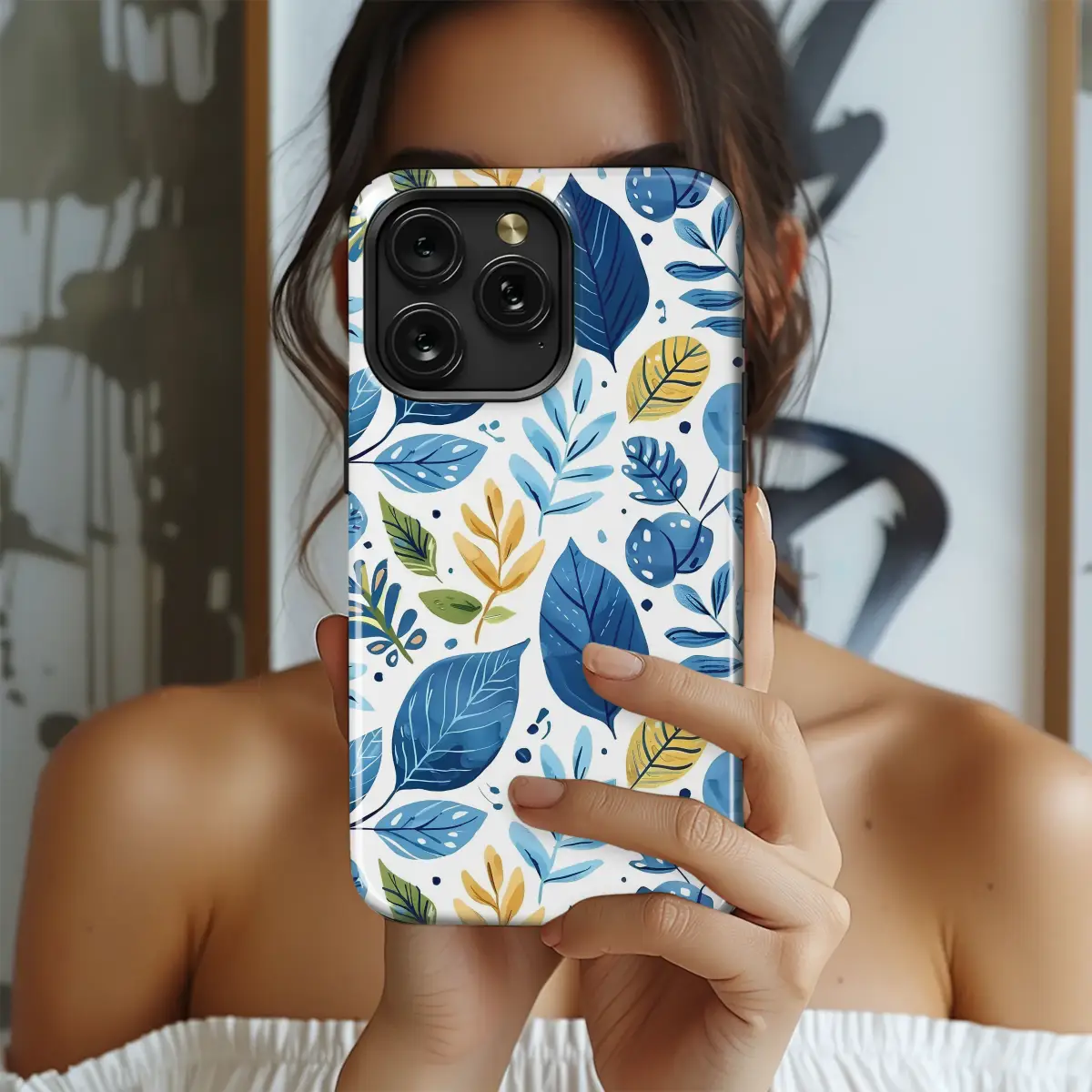Embrace the beauty of nature with this elegant botanical design. A captivating pattern of stylized leaves in serene shades of deep blue, light blue, and warm yellow-gold dances across a clean white background. This modern, artistic print brings a touch of sophisticated, natural charm to your everyday carry.