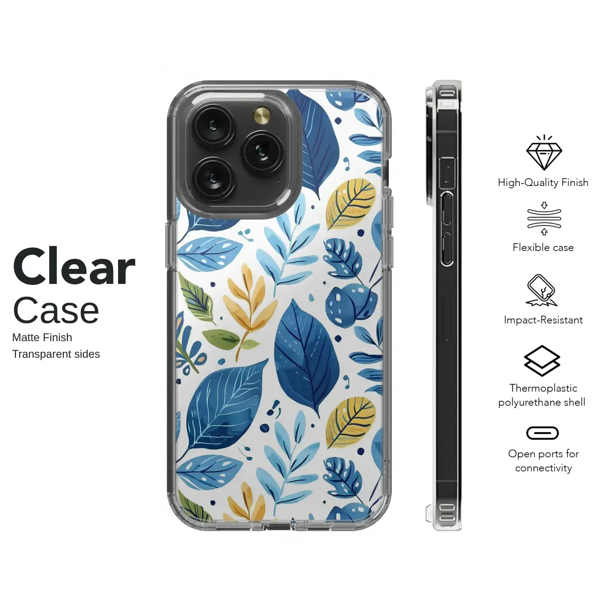 Embrace the beauty of nature with this elegant botanical illustration. This modern design features a charming pattern of stylized leaves in a sophisticated color palette of deep blues, sunny yellows, and subtle greens, all set against a clean white background. The artistic arrangement creates a vibrant yet calming aesthetic, perfect for anyone who appreciates contemporary nature-inspired art.
