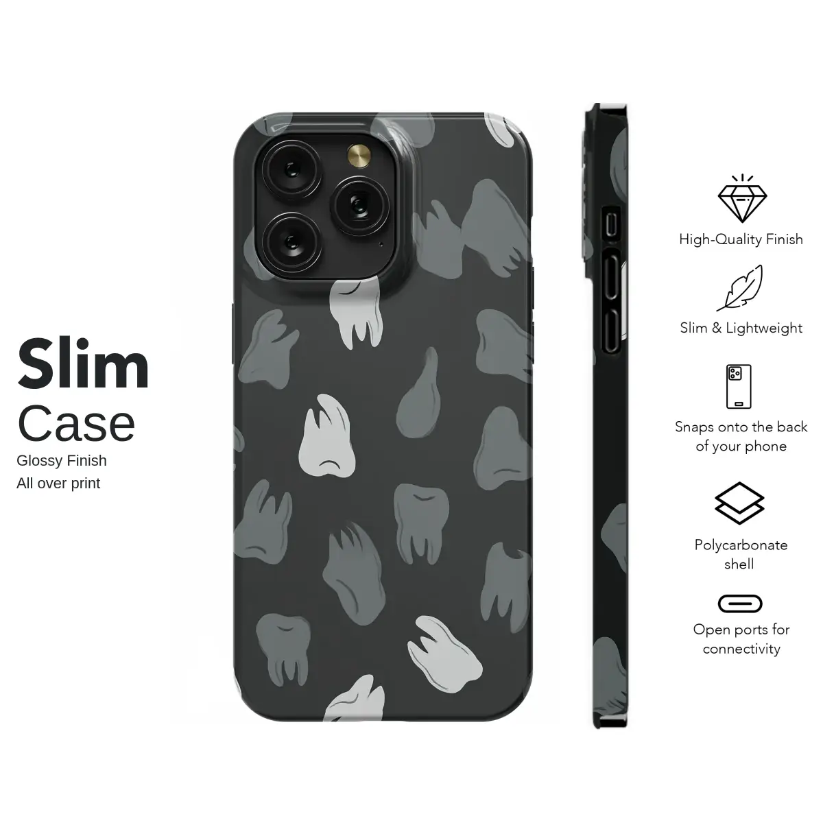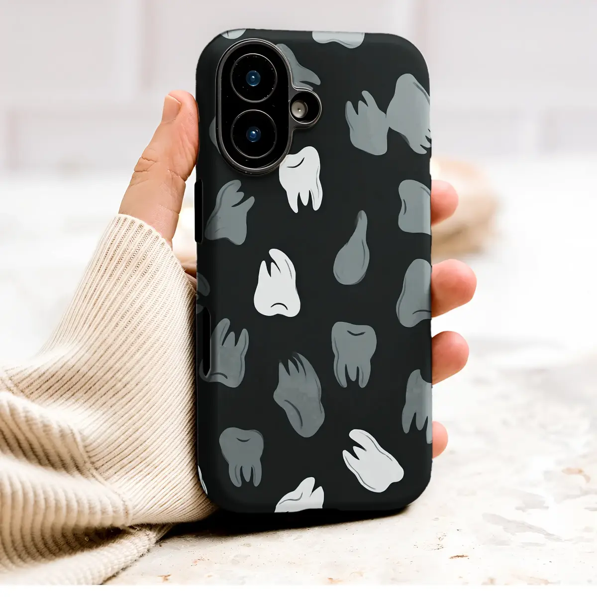 Showcase your passion for dentistry with this unique and stylish design. It features a modern, repeating pattern of illustrated teeth in minimalist shades of grey and white against a classic black background. This fun yet sophisticated design is perfect for dentists, dental hygienists, assistants, and students looking to add a touch of personality to their everyday essentials.