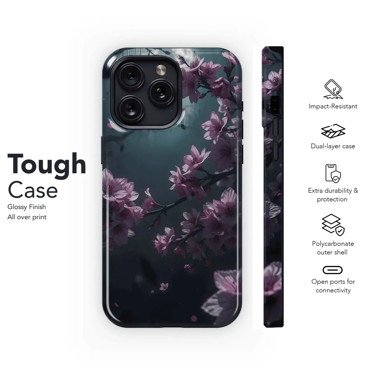 Capture the ethereal beauty of a moonlit sakura garden. This stunning phone case, compatible with iPhones, Samsung, and Pixel (4/4a/6/6 Pro), protects your device while showcasing delicate, blooming cherry blossoms against a serene night sky. A touch of elegance for everyday.