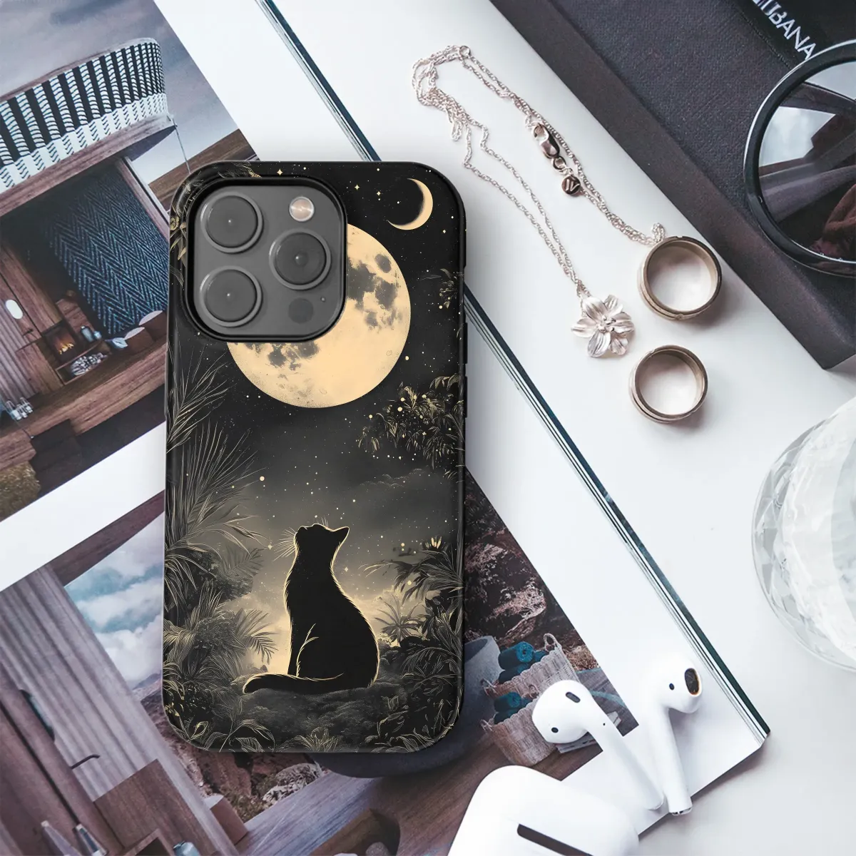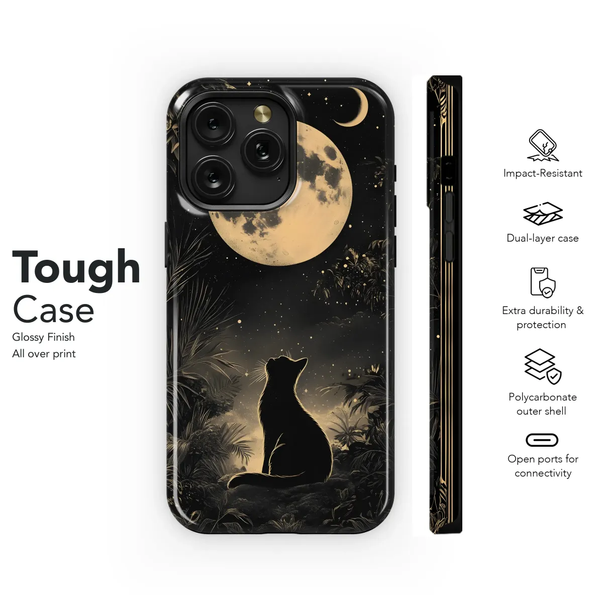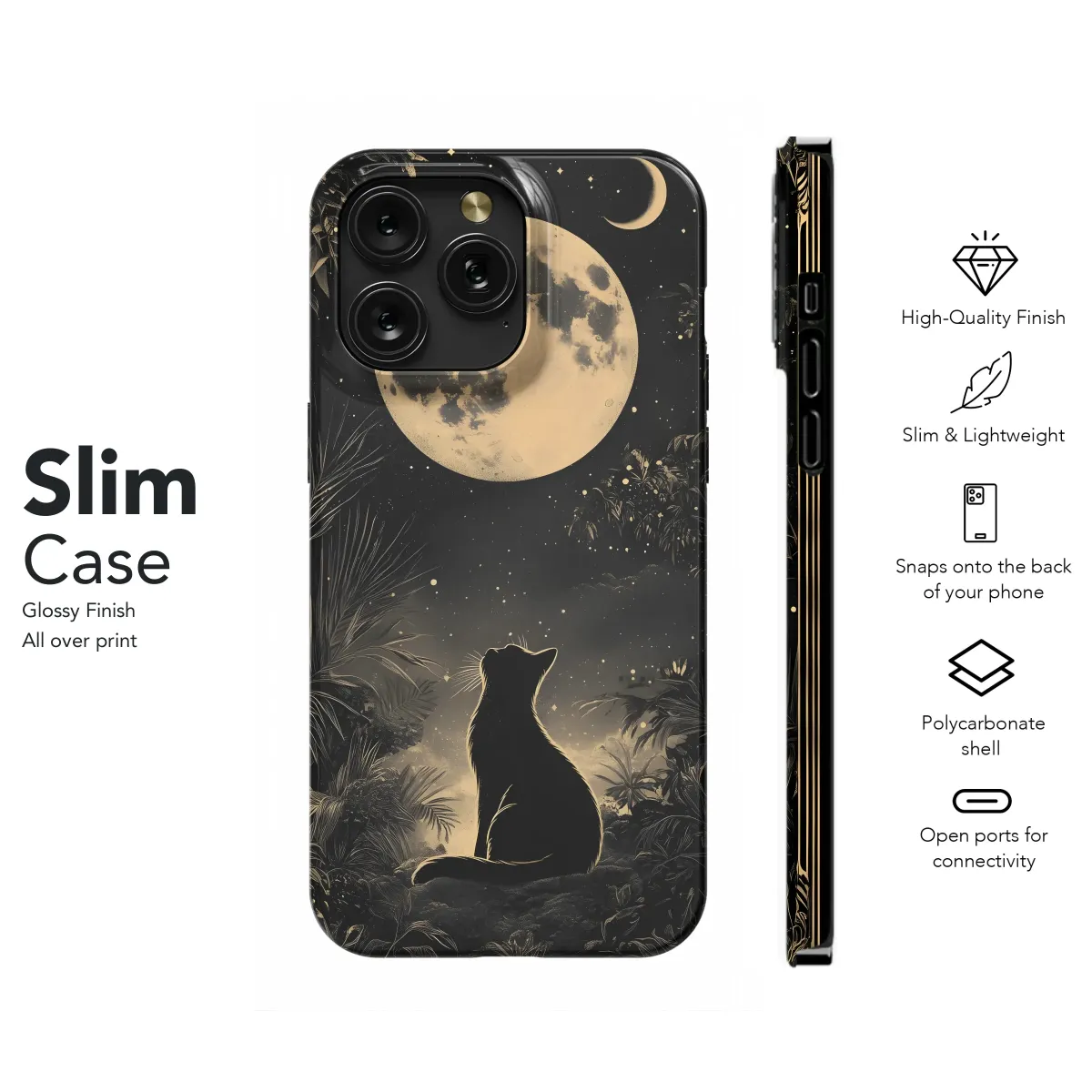 Embrace the celestial charm with this captivating art print, showcasing a mystical black feline gazing up at a luminous full moon under a star-strewn sky. Framed by lush, tropical foliage and an ornate border, this design evokes a sense of magical realism and bohemian elegance. Perfect for adding a touch of cosmic wonder to your everyday carry, this artwork appeals to lovers of astrology, nature, and all things mystical. Let the moon's enchanting glow and the cat's unwavering gaze inspire your daily adventures. Ideal for those seeking unique gifts or distinctive art pieces, this celestial cat design is sure to spark conversations and elevate your personal style. Discover the purrfect blend of artistry and cosmic energy with this moonlit feline masterpiece, guaranteed to enchant cat lovers and astrology enthusiasts alike. Explore the magic of the night sky and add a touch of bohemian flair with this unique artwork, perfect for expressing your individuality and love for the celestial realm. It’s more than just a design; it's a statement.