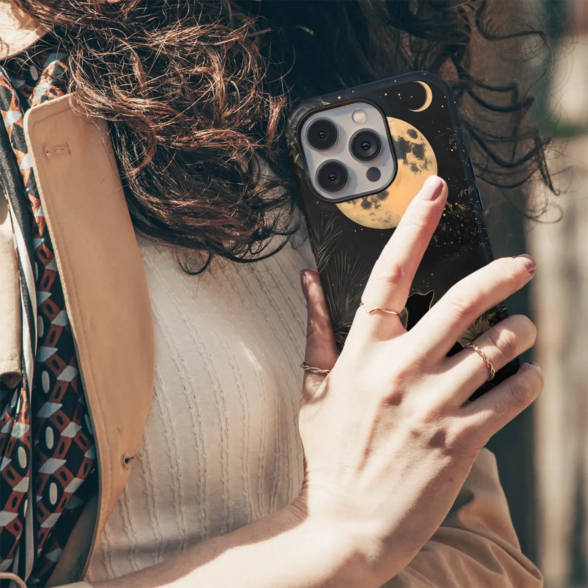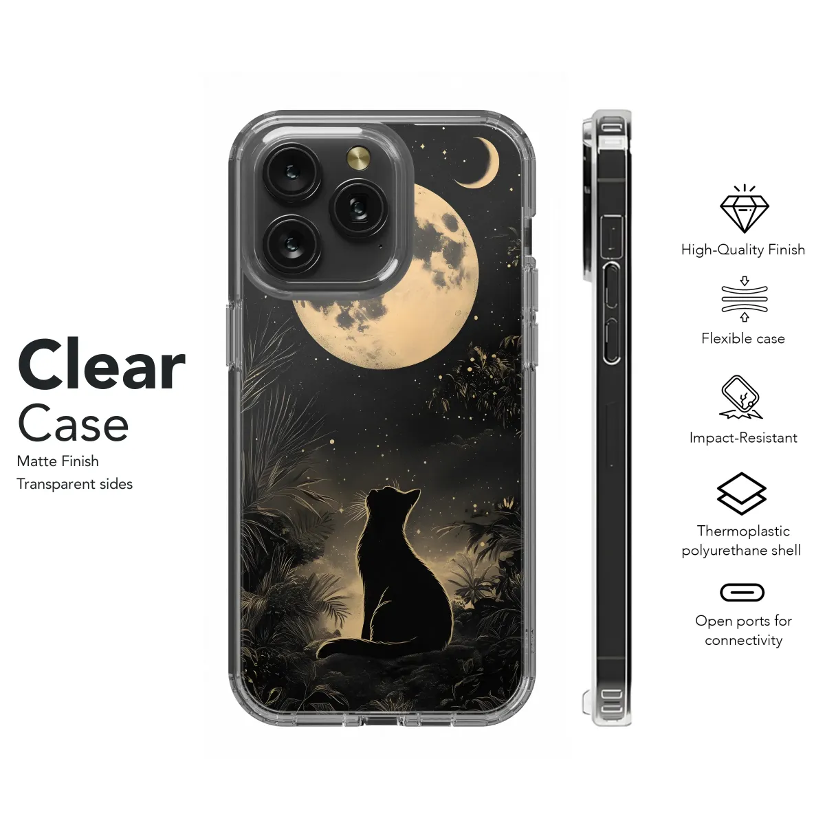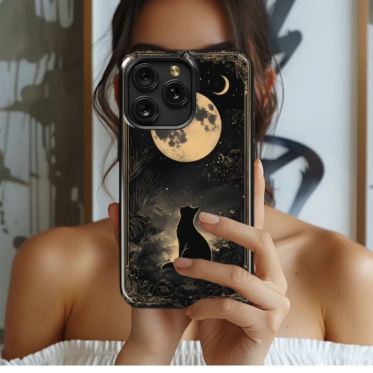 Embrace the celestial charm with this captivating art print, showcasing a mystical black feline gazing up at a luminous full moon under a star-strewn sky. Framed by lush, tropical foliage and an ornate border, this design evokes a sense of magical realism and bohemian elegance. Perfect for adding a touch of cosmic wonder to your everyday carry, this artwork appeals to lovers of astrology, nature, and all things mystical. Let the moon's enchanting glow and the cat's unwavering gaze inspire your daily adventures. Ideal for those seeking unique gifts or distinctive art pieces, this celestial cat design is sure to spark conversations and elevate your personal style. Discover the purrfect blend of artistry and cosmic energy with this moonlit feline masterpiece, guaranteed to enchant cat lovers and astrology enthusiasts alike. Explore the magic of the night sky and add a touch of bohemian flair with this unique artwork, perfect for expressing your individuality and love for the celestial realm. It’s more than just a design; it's a statement.