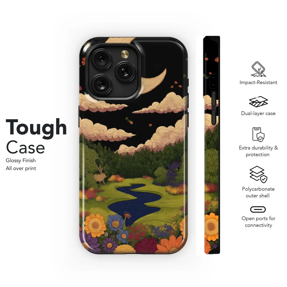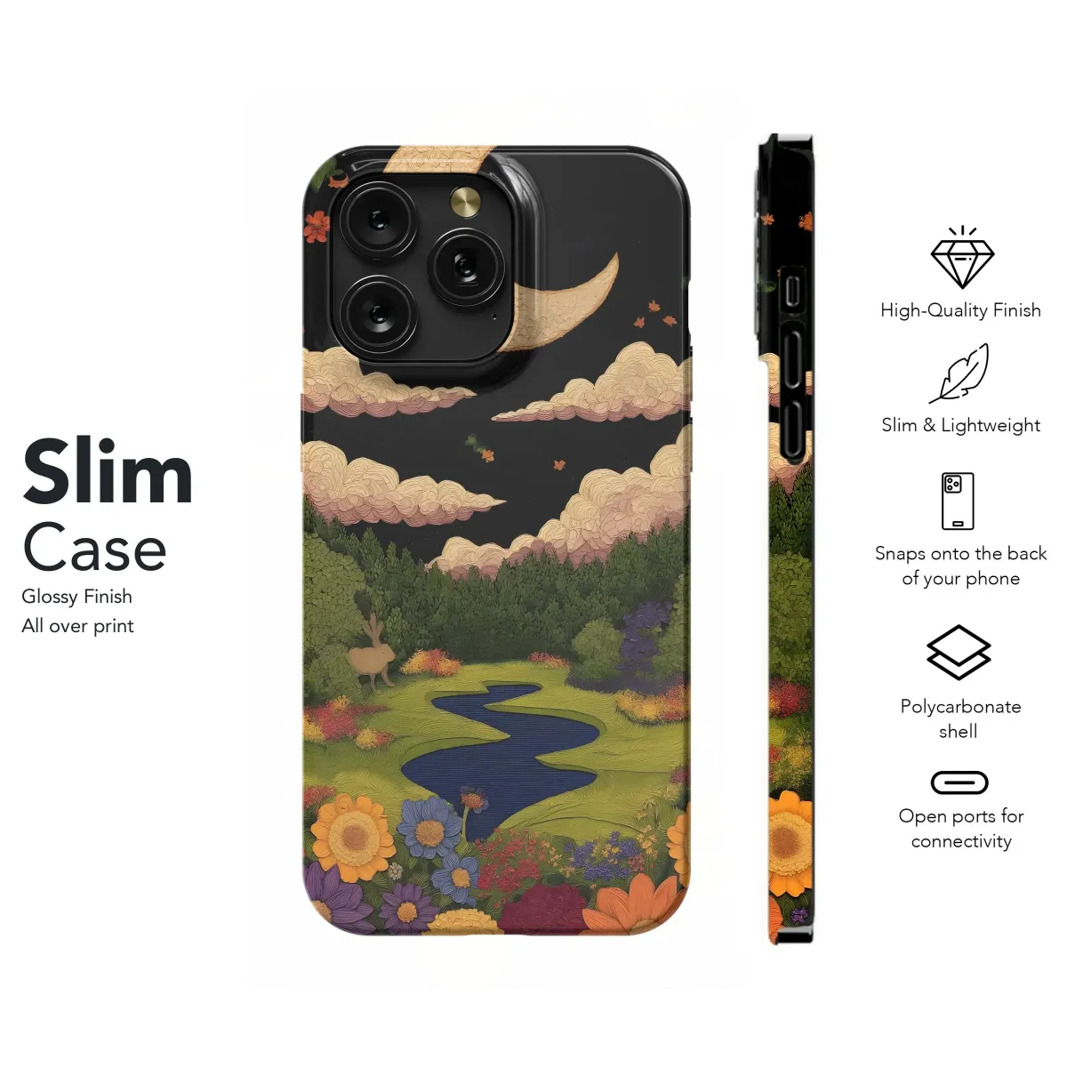 Embrace the tranquility of twilight with this whimsical landscape design, perfect for adding a touch of nature-inspired art to your everyday essentials. This enchanting illustration features a serene river meandering through a lush meadow, framed by a vibrant array of blooming flowers and a deep green forest under a dreamy moonlit sky with fluffy clouds. A lone deer graces the landscape, adding to the overall sense of peace and wonder. The rich, textured details and vibrant colors bring this mystical scene to life, making it a stunning and unique statement piece. Ideal for those who appreciate nature art, moon art, floral art, or seek a dreamy aesthetic. Enhance your everyday life with a touch of magic and wonder. This design is perfect for nature lovers, dreamers, and anyone looking to add a unique and whimsical touch to their accessories.