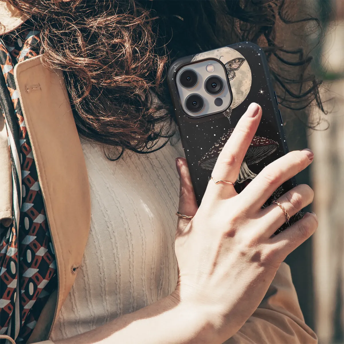 Embrace the magic of the night with this enchanting design. Featuring a mystical mushroom bathed in moonlight, adorned with a delicate butterfly and a celestial pendant, it captures the essence of fantasy and wonder. Intricate details and a captivating color palette bring this dark academia-inspired artwork to life. This mysterious and captivating piece is perfect for adding a touch of whimsical gothic elegance to your personal style, showcasing your unique appreciation for the fantastical and the beautiful. The design is printed using high-quality inks for vibrant, long-lasting color and a smooth, soft feel. It's more than just a protective covering; it's a statement piece that speaks volumes about your personality and your love for all things magical and mysterious. Transform your everyday accessory into an expression of your inner enchantment with this truly unique design, perfect for those who appreciate art, nature, and a touch of the mystical. It's a conversation starter, a work of art you can carry with you wherever you go, and a constant reminder of the magic that surrounds us. Secure yours today and let your mystical side shine.
