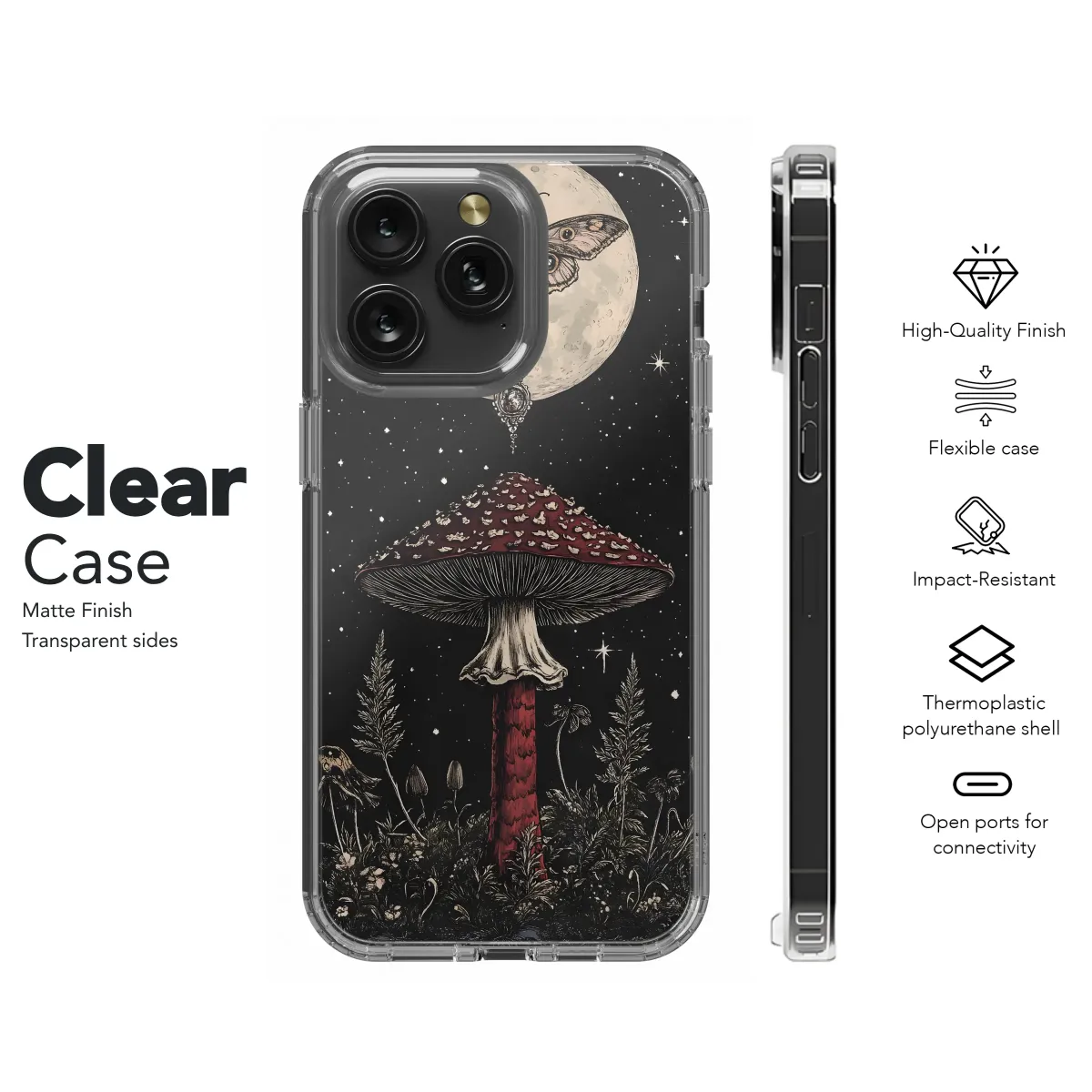 Embrace the magic of the night with this enchanting design. Featuring a mystical mushroom bathed in moonlight, adorned with a delicate butterfly and a celestial pendant, it captures the essence of fantasy and wonder. Intricate details and a captivating color palette bring this dark academia-inspired artwork to life. This mysterious and captivating piece is perfect for adding a touch of whimsical gothic elegance to your personal style, showcasing your unique appreciation for the fantastical and the beautiful. The design is printed using high-quality inks for vibrant, long-lasting color and a smooth, soft feel. It's more than just a protective covering; it's a statement piece that speaks volumes about your personality and your love for all things magical and mysterious. Transform your everyday accessory into an expression of your inner enchantment with this truly unique design, perfect for those who appreciate art, nature, and a touch of the mystical. It's a conversation starter, a work of art you can carry with you wherever you go, and a constant reminder of the magic that surrounds us. Secure yours today and let your mystical side shine.