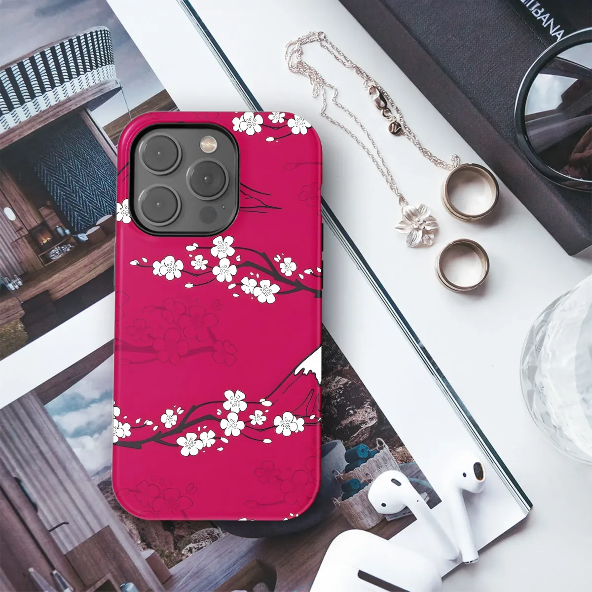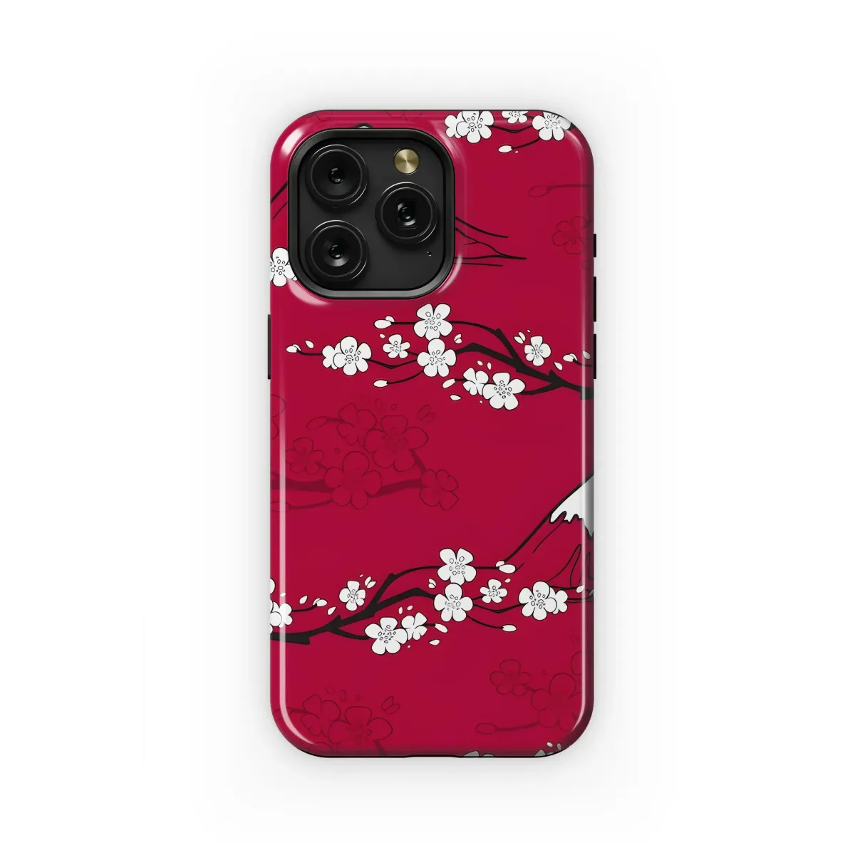 Immerse yourself in the serene beauty of Japanese artistry with this captivating design featuring a seamless pattern perfect for elevating your everyday essentials. A vibrant crimson backdrop sets the stage for delicate white cherry blossom clusters, their ephemeral beauty captured on elegant dark branches that wind gracefully across the composition. Standing proudly amidst the blooming sakura is the iconic, snow-capped silhouette of Mount Fuji, a symbol of strength and tranquility in Japanese culture. This exquisite artwork evokes the feeling of spring in Japan, blending natural beauty with timeless cultural motifs. Inspired by traditional ukiyo-e aesthetics, the design offers a harmonious balance of detail and simplicity, creating a visually stunning piece that is both classic and contemporary. Carrying this unique design is a way to express your appreciation for Asian art, nature's elegance, and sophisticated style. It adds a touch of cultural richness and visual delight to any item it adorns, making it a perfect accessory for art lovers and anyone seeking a distinctive look. This elegant pattern serves as a beautiful reminder of peaceful landscapes and blooming seasons, providing a sense of calm and elegance wherever you go, and makes a thoughtful gift for yourself or a loved one who cherishes beautiful and meaningful designs.