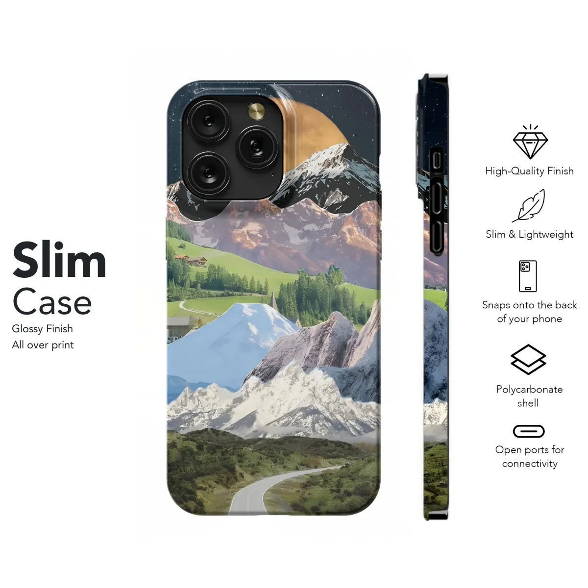 Evoke the spirit of the mountains under a luminous moon with this stunning phone case. Featuring a captivating mountain collage design, this case protects your iPhone, Samsung, or Pixel (4969 model) while adding a touch of adventure to your everyday.