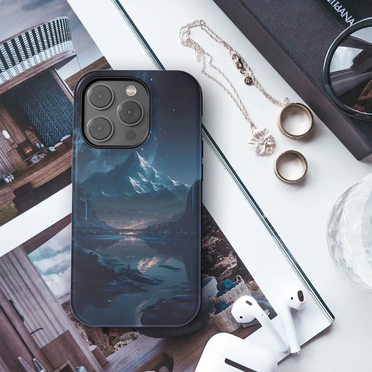 Capture the serene beauty of a starry mountain night with this stunning phone case. Featuring a crystal-clear reflection design, this cover protects your iPhone, Samsung, or Pixel (4/8/5/5) while showcasing a breathtaking landscape.