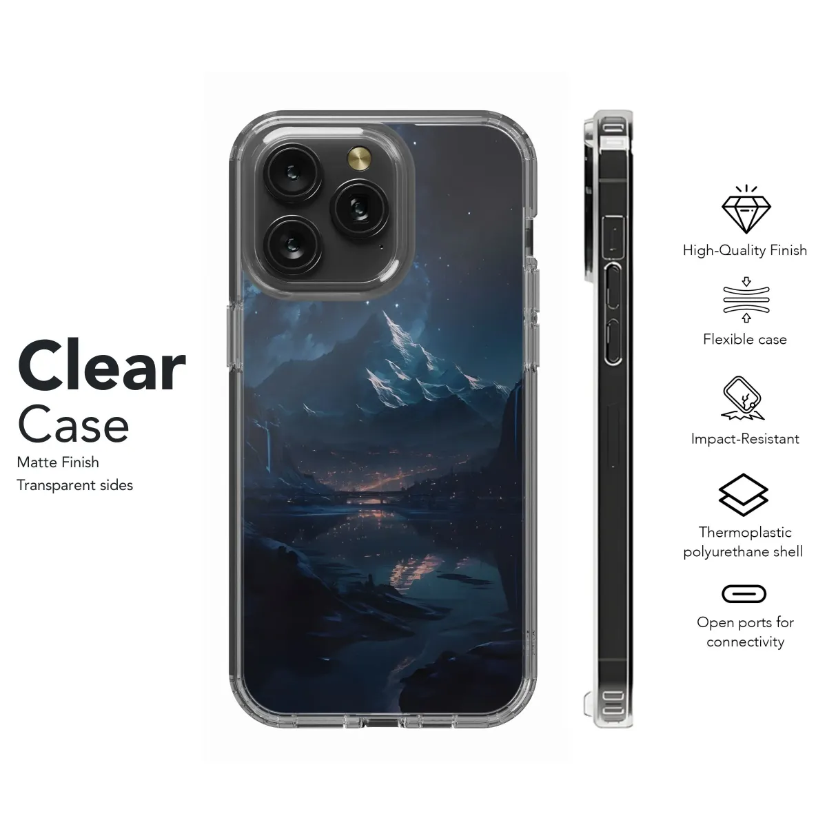 Capture the serene beauty of a starry mountain night with this stunning phone case. Featuring a crystal-clear reflection design, this cover protects your iPhone, Samsung, or Pixel (4/8/5/5) while showcasing a breathtaking landscape.