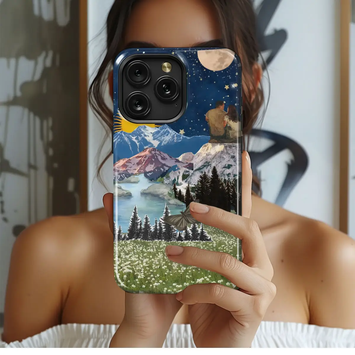 Adorn your devices with this mesmerizing celestial mountainscape design. This art print features a stunning collage of nature's wonders. A golden sun rises above majestic mountain peaks, while a shimmering moon and twinkling stars illuminate the night sky where two figures sit in peaceful contemplation. Below, a serene lake reflects the sky's beauty, bordered by lush evergreen forests and a delicate field of dandelions where a butterfly rests. This captivating artwork evokes a sense of adventure, love, and tranquility, perfect for those who appreciate dreamlike, romantic landscapes and outdoor scenery. Ideal for nature lovers, dreamers, and anyone seeking a touch of serenity in their everyday carry. Elevate your personal style with this artistic celestial design, a unique statement piece. Perfect gift for anniversaries, birthdays, and as a reminder of shared moments under the stars. Let this beautiful vista accompany you wherever you go.