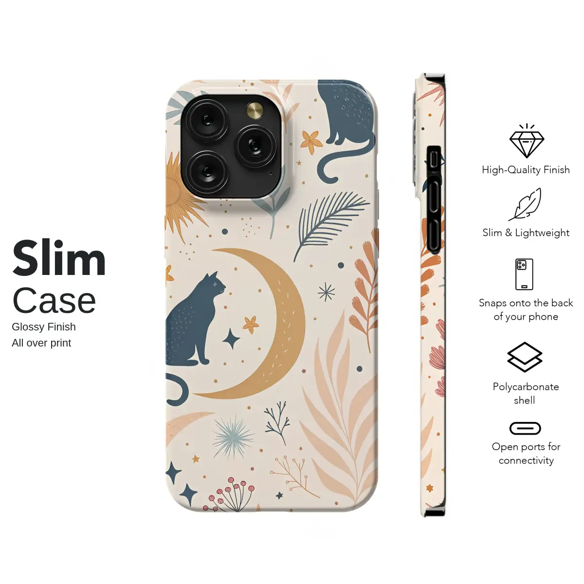 Step into a whimsical dreamscape where the cosmos meets a secret, earthly garden, a place where magic feels just within reach. Mysterious black cats, the silent guardians of the night, sit serenely perched upon golden crescent moons, their elegant silhouettes a stark contrast against a canvas of twinkling stars and radiant, stylized suns. This enchanting pattern masterfully weaves together celestial wonder with the quiet beauty of nature, featuring a delicate tapestry of bohemian botanicals. Observe the soft, muted tones of terracotta, dusty blue, deep navy, and warm cream, which together create a soothing and deeply aesthetic vibe that calms the soul. The intricate details in the delicate leaves, whimsical flowers, and cosmic symbols invite you to lose yourself in its story, whispering of quiet starlit nights, ancient wisdom, and the gentle magic that surrounds us every day. This isn't just a design; it's a portable piece of art that captures the serene and mystical spirit of a stargazing feline. It is the perfect accessory for the modern mystic, the devoted dreamer, the nature lover, or anyone who finds deep comfort in the quiet company of a cat and the vast, breathtaking beauty of the night sky. This unique artwork makes a thoughtful gift for a kindred spirit or a beautiful treat for yourself, adding a touch of witchy, cottagecore charm to your most essential items.