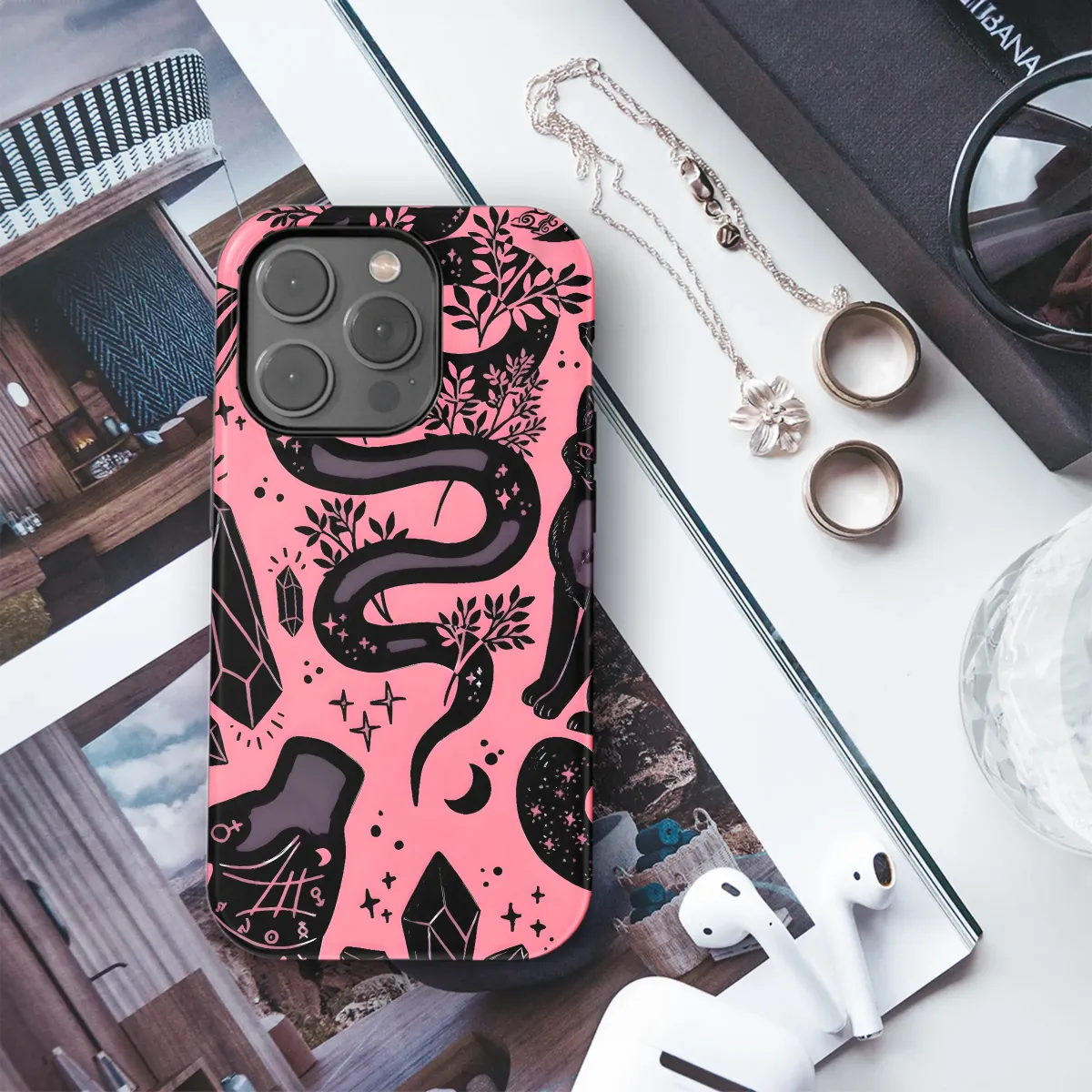 Embrace mystical allure with this enchanting design, featuring a captivating serpent intertwined with flourishing flora, a sleek black feline, and glistening crystals. The vibrant pink backdrop enhances the dark, gothic aesthetic, accented by celestial moons and shimmering stars. Palmistry symbols add a touch of esoteric charm, while other mystical elements like a moth and mushrooms complete the otherworldly scene. This striking pattern is perfect for adding a touch of dark academia and gothic fantasy to your everyday life. A unique and eye-catching print that will make a bold statement. Its vibrant colours and detailed illustration make it a perfect gift for those who appreciate captivating art, mystical designs, and gothic aesthetics. This captivating design is a must-have for anyone who loves unique and expressive accessories and wants to showcase their personality. The high-quality print ensures vivid colours and sharp detail that will last, capturing the mysterious essence of this enchanting artwork.