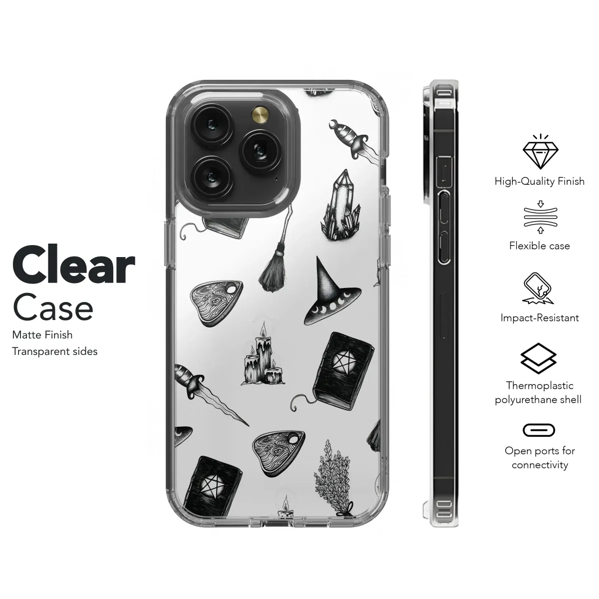 Embrace your mystical side with this enchanting design featuring a captivating pattern of witch hats, mystical books, crystals, candles, and more. This captivating print showcases a blend of gothic and occult aesthetics, perfect for those who appreciate the mysterious and the magical. The intricate line art and monochrome palette create a sophisticated and stylish look, making this a unique and eye-catching accessory. This design is printed with high-quality inks to ensure vibrant, long-lasting color and detail. It’s a perfect gift for yourself or the witchy one in your life who appreciates unique, dark academia-inspired designs. This darkly romantic, subtly spooky artwork adds a touch of mystique to your everyday life, making a statement without being overly flashy. Express your individuality and celebrate the magic within with this stunning and evocative accessory. Show off your enchanting style and mysterious spirit with this beautifully designed accessory. Its elegant simplicity and powerful symbolism will resonate with anyone drawn to the enchanting world of witchcraft and the occult. This piece is a testament to the enduring allure of gothic style and dark aesthetics.