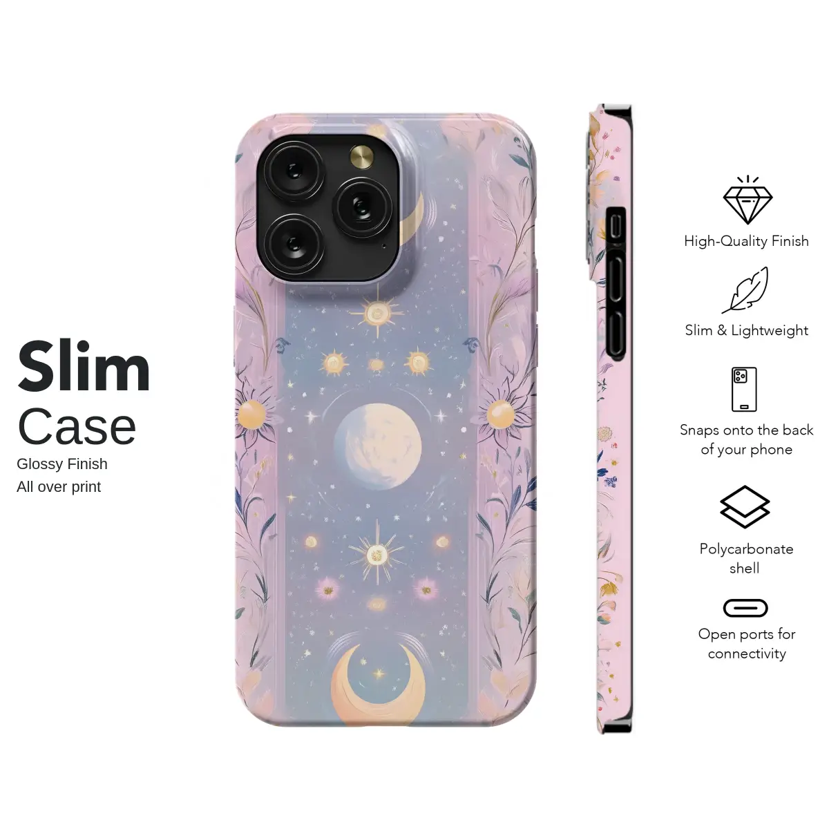 Embrace the magic of the cosmos with this enchanting celestial design. The artwork features a stunning depiction of the moon phases, from a luminous full moon to delicate crescents, scattered across a dreamy, star-dusted night sky in shades of pastel purple and blue. This mystical scene is beautifully framed by whimsical botanical illustrations, with delicate flowers and flowing leaves in soft pinks and golds, adding a touch of earthly elegance to the cosmic display.