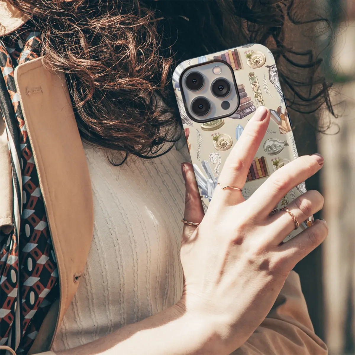 Wrap your device in whimsical wonder with this enchanting bohemian-inspired design! Featuring a repeating pattern of watercolor-style illustrations, this design is a medley of natural curiosities and mystical elements. Majestic owls perch amongst sparkling crystals, stacks of aged books, delicate ferns, and miniature cloches filled with wildflowers. A touch of earthy magic is added with detailed seashells and intriguing potion bottles. This unique pattern is perfect for anyone who loves nature, vintage aesthetics, and a touch of the otherworldly. Accessorize your tech with this unique, artistic, whimsical, and bohemian accessory. Ideal for nature lovers, bookworms, and those seeking a touch of magic in their everyday lives. Grab this must-have accessory and showcase your unique style with this captivating design!